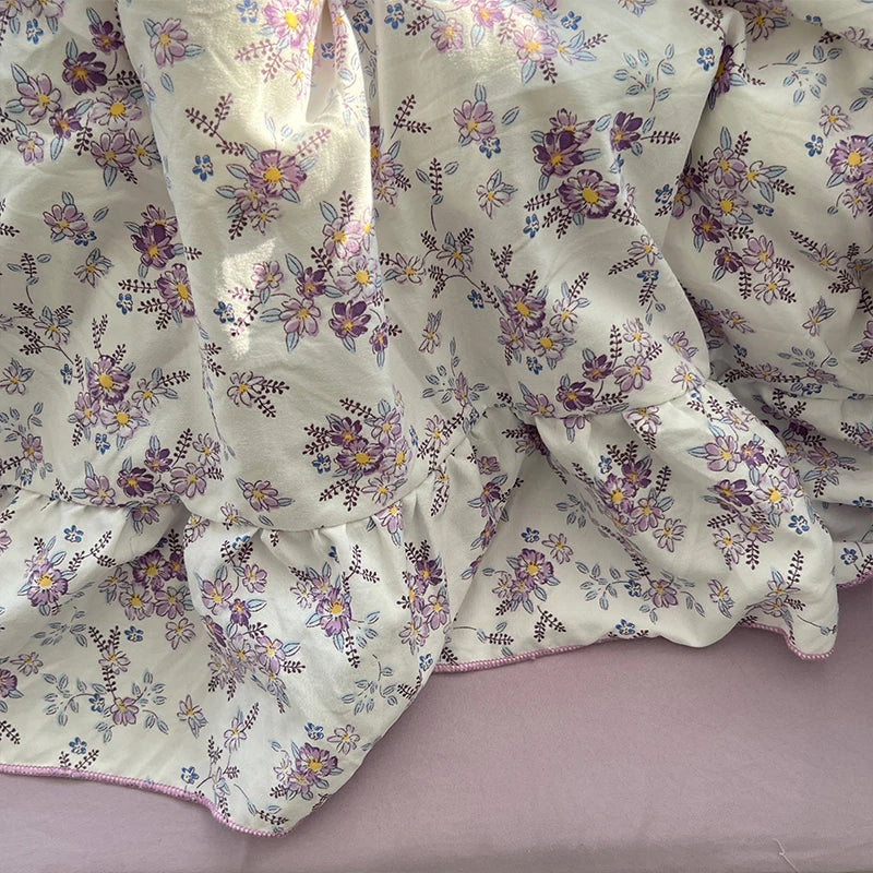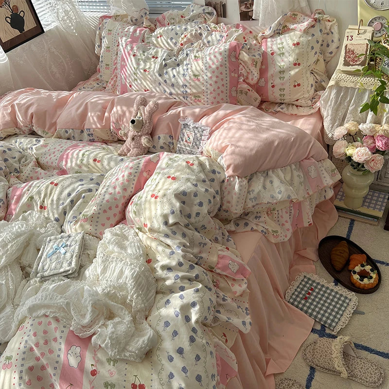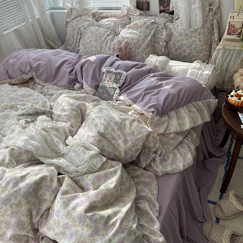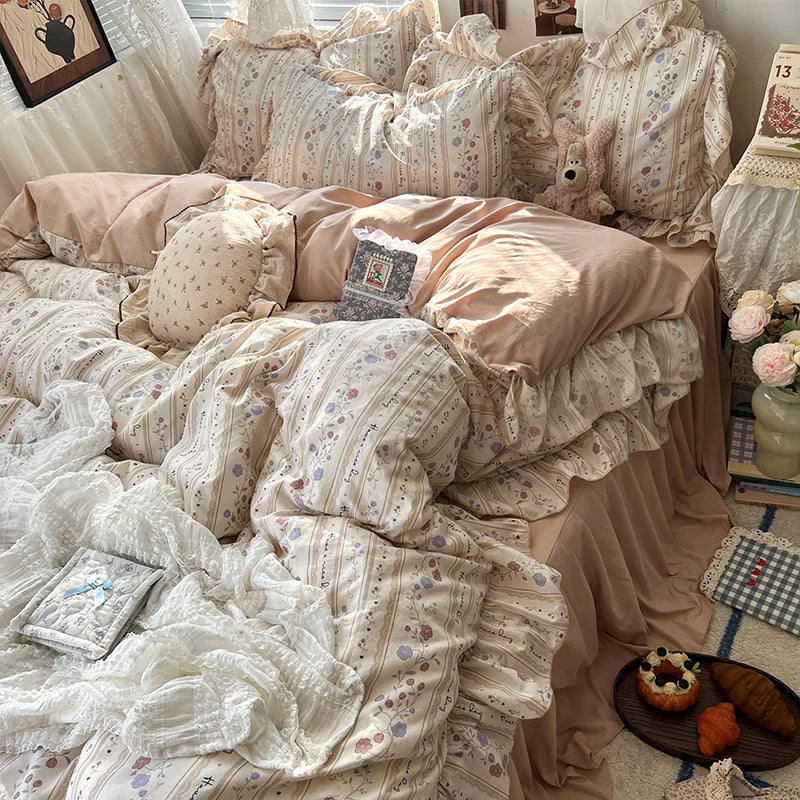 3/4Pcs Korean Princess Style Floral Ruffles Bedding Set Skin-friendly Soft Duvet Cover Set Bed Sheet Or Bed Skirt Pillowcases