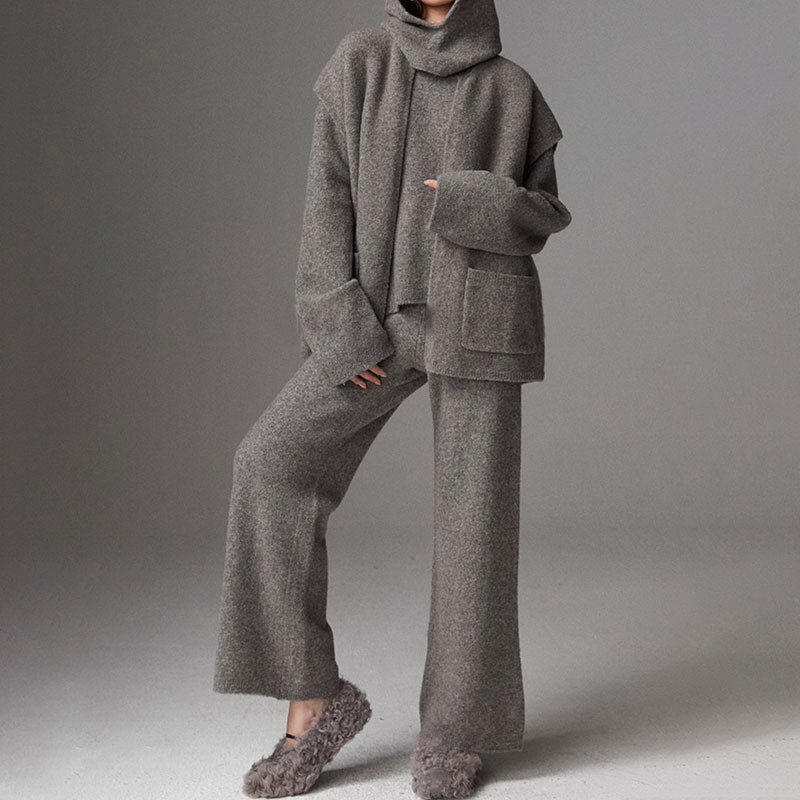 Meet your year-round fashion ally in our athflow style granular fleece matching set. available in stylish gray. black. and dusty pink. This versatile four-piece knit set boasts a knit vest with patch pockets. oversized sweater with long sleeves. knitted balaclava. and high waist wide leg knit pants. This knitted lounge set embodies the essence of sport fashion �a harmonious fusion of athletic ease and effortless style. Wear it with fluffy flats for a leisure and daytime look.