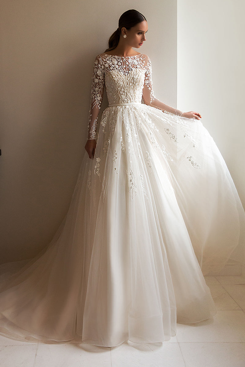 Everyone in the room will fall in love with your style when you walk down the aisle wearing the Bennett Long Sleeve Wedding Dress! Airy tulle fabric overlays the bodice of this stunning bridal gown. shaping sheer long sleeves. illusion scoop neckline and floral lace appliques throughout. Fitted high waist tops an a-line skirt that falls to a maxi hem with a luxurious court train at the back. Hidden zipper/clasp at back.