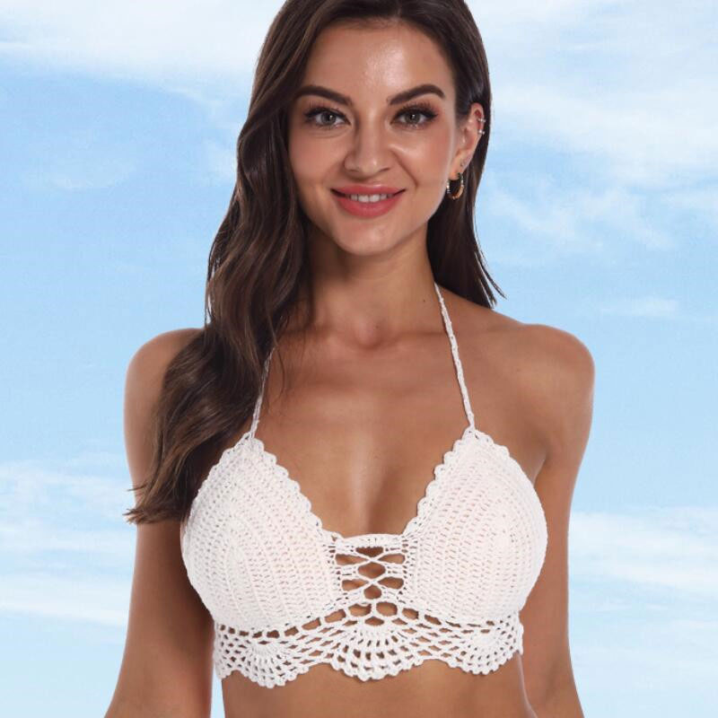 Keep the party going past the beach in our bikini top. Fully crocheted with intricate pattern for an exclusive boho-chic vibe. the bikini top has built-in shaped cups in a triangle silhouette that's traced by beautiful macramé scalloped trim. Show off some skin with the bare back that's framed by halter drawstring cords to tie the neck and a back-tie closure. Wear yours with crochet bikini bottoms for your next pool-side party.