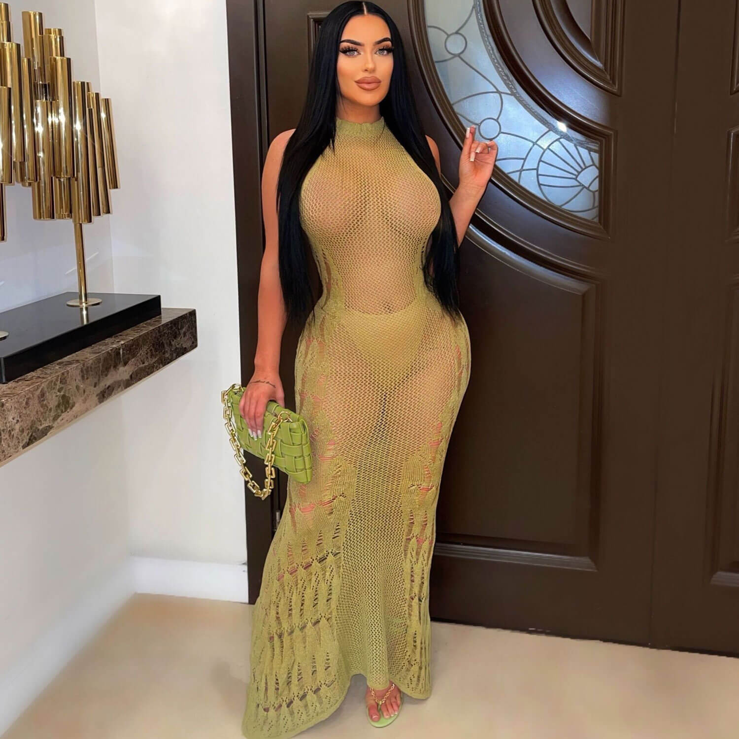 Capturing summer allure. our vacation-ready crochet maxi dress is a joyful and irresistible cover-up dress guaranteed to set the mood for summer. This flattering summer open knit sheer dress boasts a high round neck and a tank cut for undeniable sophistication. Highlighted by intricate ripped ladder details at the sides. it offers a slimmer. body-hugging silhouette. While the high crew neck and flowy mermaid full length ensure an elegant. head-turning profile. A sexy knitwear for long weekends.