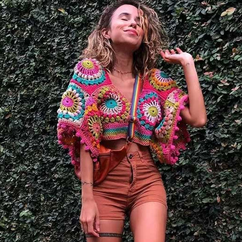 Maybe you want a knit top that screams summer? Here it is. This cropped knit is one of our most popular items. The acrylic knitted fabric feels so comfortable to wear. Featuring a V neckline. voluminous short sleeves and a cute crop length. the knit top is loose knit with granny square patterns. making it a summer-appropriate piece with all the breezy feel. The relaxed silhouette is ultimately finished with a fitted waist. which is further emphasized by color-rich stripes. Giving a sense of playful bohemian vibe. the short-sleeved knit is easy to match with a variety of bottoms. expanding the width of your wardrobe with multiple activities.