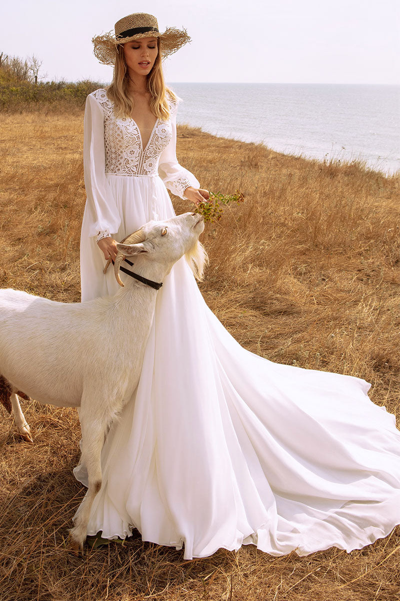 Open your eyes to a world of beautiful possibilities in the Bonaire Lace Chiffon Bridal Gown! Non-stretch. bohemian inspired lace elegantly graces the fitted bodice of this stunning dress. with a plunging V-neckline and sheer long sleeves with lace cuffs. An open V-back and fitted waist sit above a romantic full length skirt that has sweep train. Hidden back zipper/clasp.