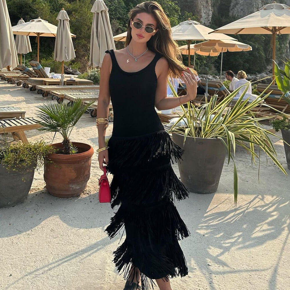 Meet your new vacation essential: this tassel knit tank dress that's set to redefine resort wear! With playful tassels swaying at the bottom. this breezy beauty brings the 'wow' to any getaway. Sporting a U-neck and a cheeky U-back. along with suspender shoulder straps. it's all about that figure-hugging allure without compromising comfort. Crafted from a dreamy cotton and acrylic blend. this sleeveless stunner offers that effortlessly chic. laid-back vibe for your sun-soaked adventures. Whether you opt for classic Black or embrace the lushness of Green. get ready to turn heads and make waves in style!