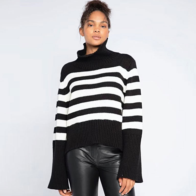 This would be the perfect first stripe number in our collection. Styled with a relaxed dropped-shouldered silhouette. the on-trend statement features a loose turtleneck and an extremely long sleeve with slit cuffs. Made from cotton and acrylic blend yarn with a soft and cozy feel. the medium-weight knit jumper is detailed with iconic stripe pattern. ribbing edges and finishes off the look with chic side slit to the hem. Keep it both modern and classic by pairing with straight-leg jeans or midi skirts for a smarter. chic preppy take on the trend.