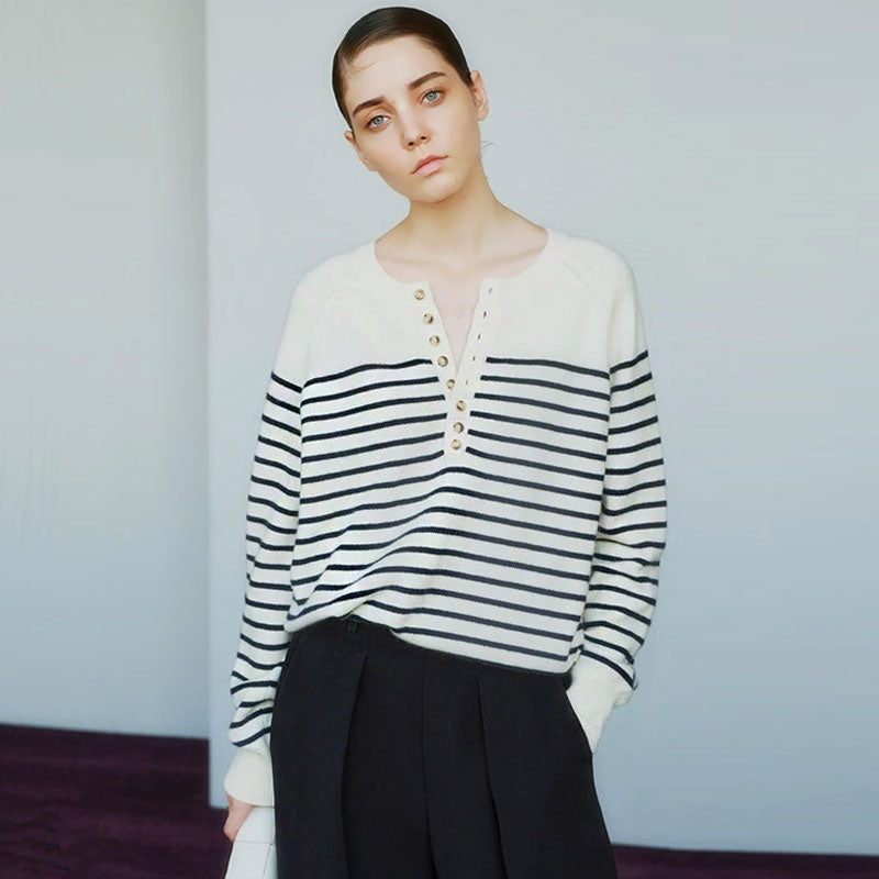 A lesson in how to nail the on-trend Breton style. Made from wool-blend material with contrasting Breton stripes. this pullover sweater has a half-button placket and tortoiseshell buttons for a truly vintage feel. The loose silhouette is defined by the signature ribbed trims and the raglan sleeves keep the vibe going casual but elevated. You can go for an ultra-preppy ensemble by styling it with Bermuda shorts. crew socks and loafers. or make it a French fashion by pairing it with white pants and ballet flats.