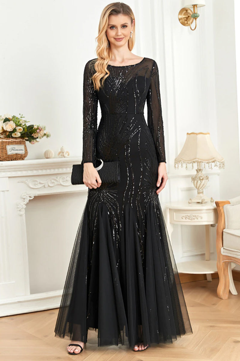Let your beauty shine from dusk till dawn in the Captivating Glam Sequin Long Sleeve Maxi Dress! Soft tulle. embellished with an eye-catching display of sequins. covers this stunning gown that has a round-neckline. long sleeves and a fitted bodice. High. empire waist flows into a maxi dress with a picture-perfect mermaid hem. Hidden back zipper/clasp.