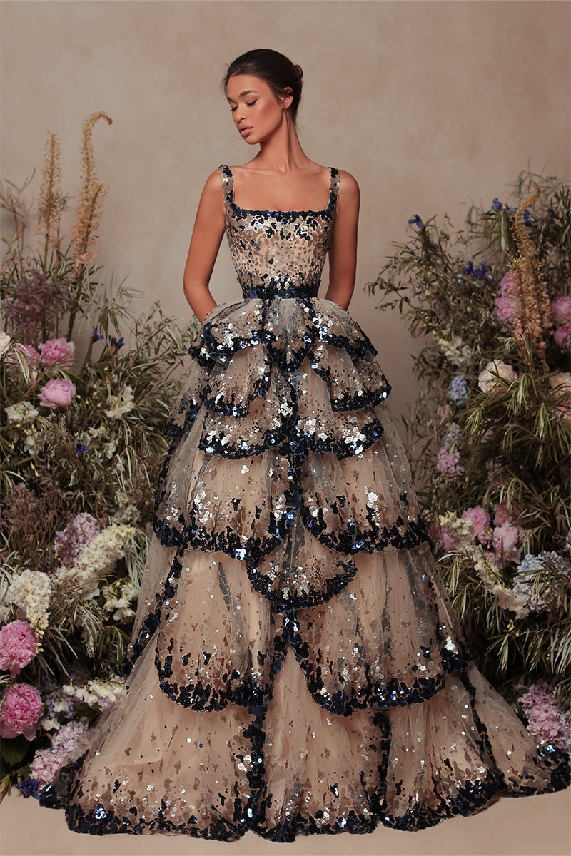 No one will be able to take their eyes off you when you strut in the Captivating Sequin Sleeveless Evening Gown! Soft champagne tulle decked out with sparking black and silver sequins over a matching poly lining shapes this stunning maxi dress has straight neckline. fitted bodice and an a-line silhouette. High fitted waist is followed by an artfully layered floor-length skirt. Hidden back zipper/clasp.