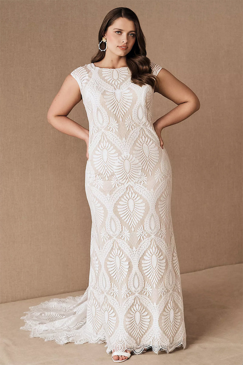 The Cherished Love Lace Mermaid Wedding Dress is a look you'll love reminiscing about for all the years to come! Eye-catching graphic lace over a nude lining lends a modern edge to a traditional bridal look. Cap sleeves and an illusion neckline top off the column silhouette and sweeping train. Open back with zipper and covered buttons.