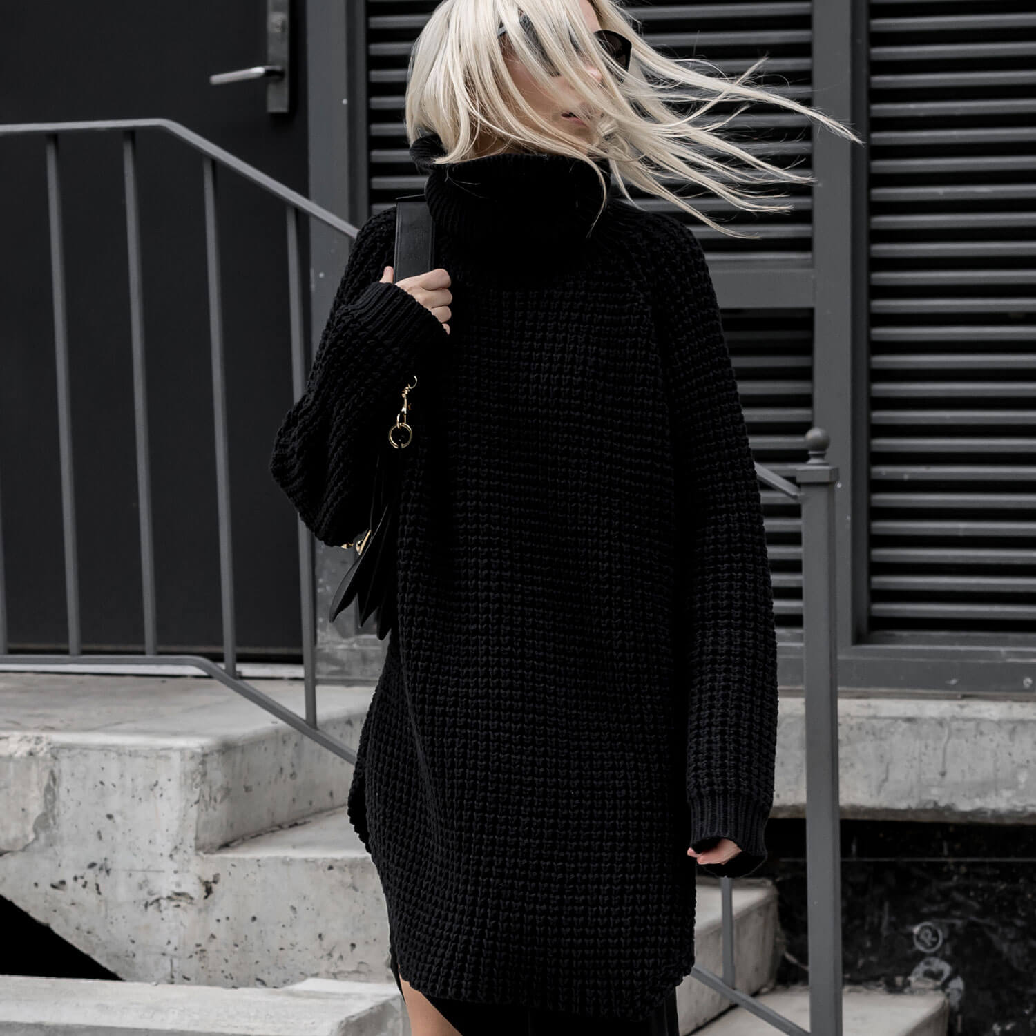 Your simple weekend look needs this chunky sweater! Our turtleneck sweater is an acrylic-spun knit into an oversized silhouette that's further balanced out by the raglan sleeves and a vented hem with thigh-high slits. The turtleneck helps lock in warmth while the open-stitching construction creates a waffle pattern throughout for textural flair. Keep it monochrome and comfy by layering it over a flowy black skirt and adding sneakers when you want to look put-together but don't want to make any efforts on it.