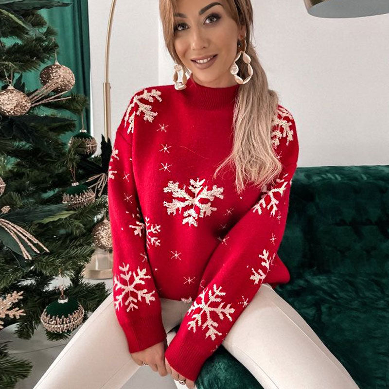 The perfect combination of a holiday sweater and a cozy pullover. meet our Christmas snowflake sweater. Knitted from polyester yarn. this warm sweater brings comfort without the bulk in a beautiful snowflake-jacquard knit with fluffy pattern for added an interesting update. Featuring an elevated mock neck. soft ribbed edges. dropped shoulders and a relaxed fit. this versatile jumper has a casual look and a cozy feel. which is exactly the epitome of joyous Christmas moments.