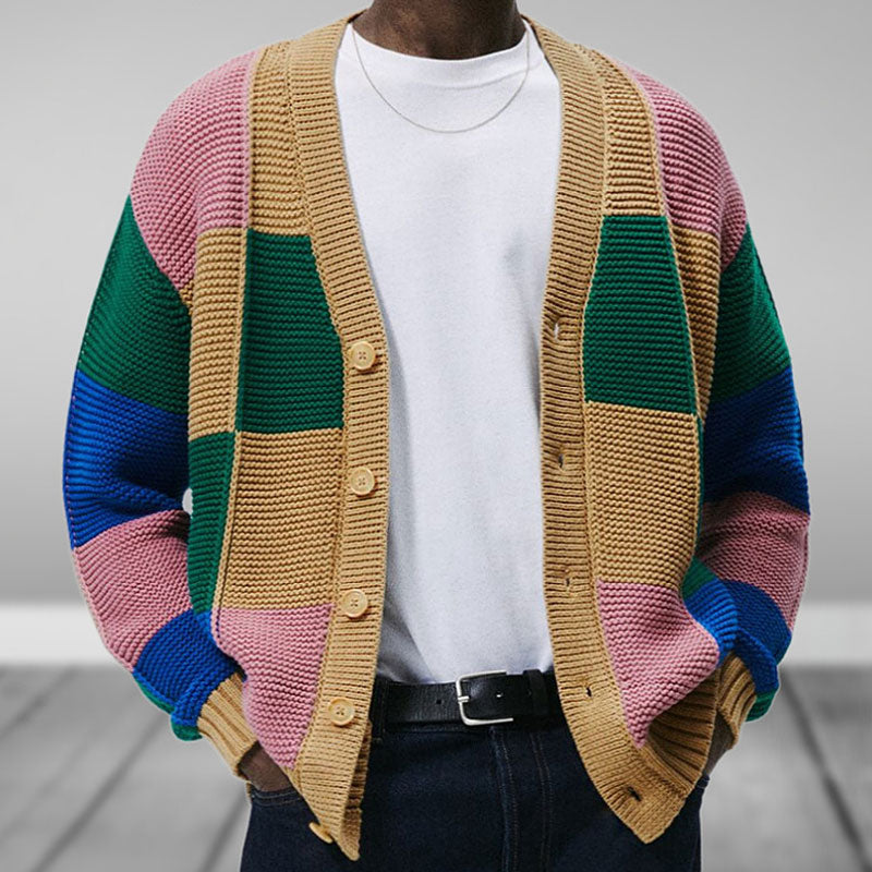 For a label with the avant-garde as a core motif. Foxsweater has a penchant for color at its heart. This exquisite cardigan sweater exemplifies its approach. with a color-blocking patchwork design which somehow remains refined and sophisticated. The loose knit cardigan is in a relaxed cut. featuring long sleeves. V neckline and button-up placket. The ribbed cuffs and hemline offer an another level of comfort with the right amount of stretch. Style it simply with a minimalist white T-shirt for a laid back urban men's sweater look.