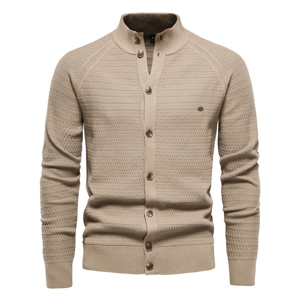 The versatile nature of this knitted cardigan. along with its solid colors. brings together the comfort and warmth of natural knitted fibers. Crafted with a textured weave. it results in a luxurious feel that is exceptionally pleasant against your skin. Featuring details like a mock neck. a button-up front. and raglan long sleeves. this men's knitwear incorporates casual elements that enhance the style of its classic fit design. Whether you choose to layer it inside or wear it as a knit jacket. this piece. with its moderate texture. is an ideal and adaptable choice for various occasions and weather conditions.
