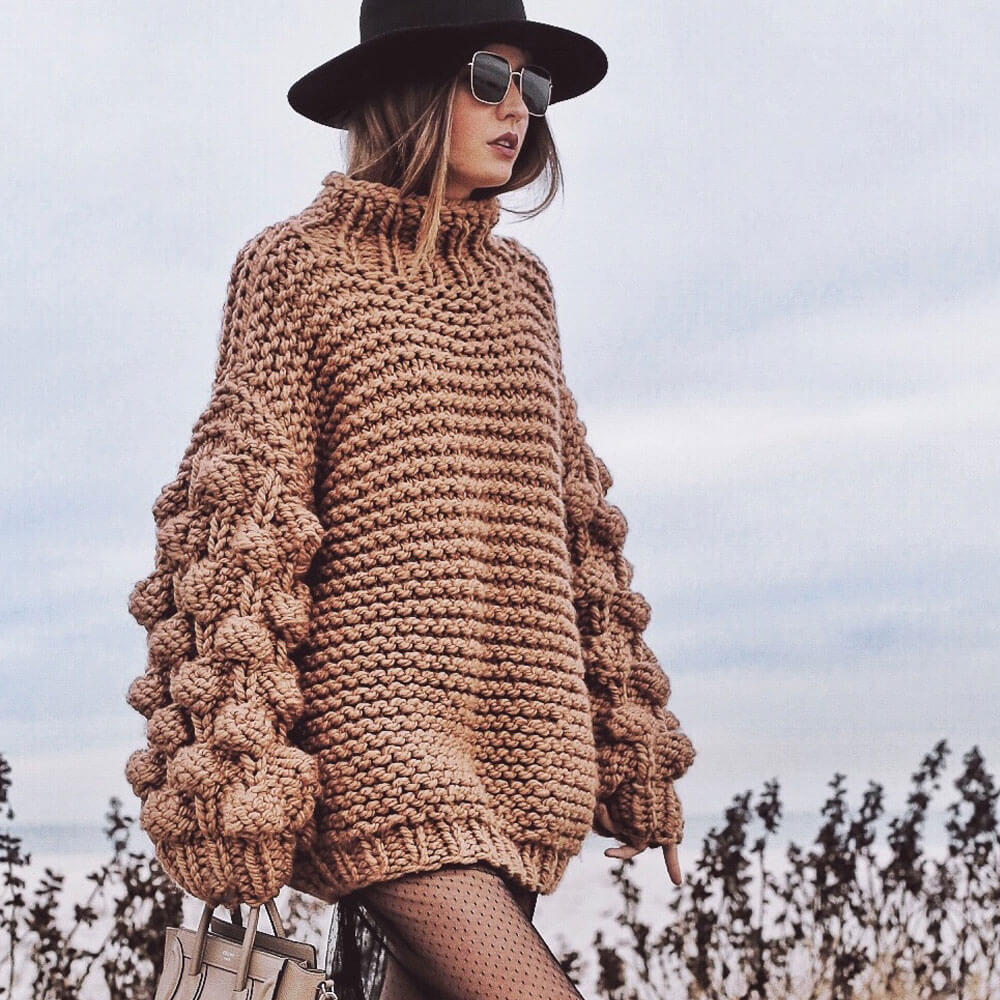 Keeping the warmth provided by the high-end Iceland yarns. the pullover sweater is in an oversized silhouette with excellent hand-knit making for a chunky sweater texture. The relaxed dropped shoulders lead to puffy balloon sleeves with ample volume that's detailed with tactile raised popcorn pattern. The high funnel-neck will keep you warm no matter what the weather throws at you. Just make sure to balance the oversized style with more fitted pieces like leggings or a fitted skirt underneath.