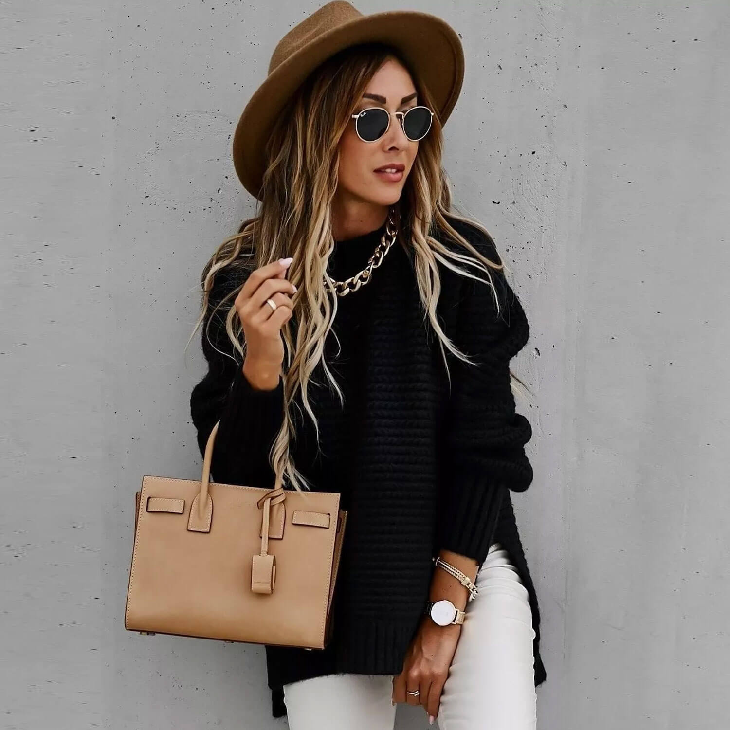 This chunky sweater will have you wishing for winter mornings. Constructed with a blended fabrication of cotton and polyester. the high-neck sweater is in a relaxed silhouette with a drop-shoulder design and loose bishop sleeves for a casually chic look. Texture-rich knit defines this solid-colored sweater and the vented hem balances out the chunky silhouette without looking bulky. Simply layer it over classic pants and add statement accessories for a cozy-chic look.