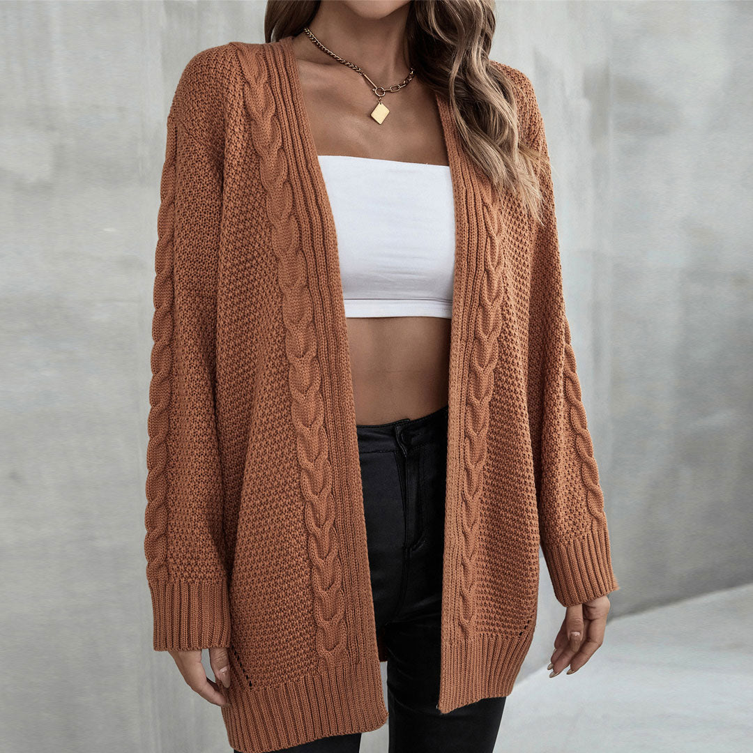 Stay warm in this thick cable-knitting. The comfortably oversized solid-color design is featured in intricate knitting from soft acrylic-blend yarns and has pointelle detail to the back. The dropped shoulders amplify its relaxed fit with loose long sleeves and are finished with ribbed cuffs and hem. The open placket is ultra autumn-appropriate that is perfect to throw on-and-go essential for an easy. effortless look.