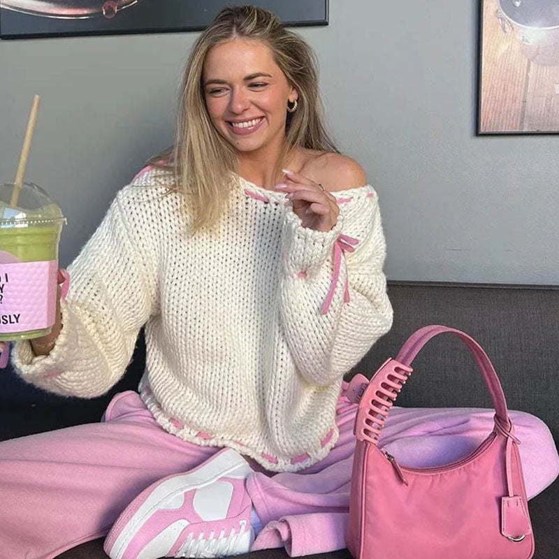 This darling bow-tie sweater brings a sweet touch to cozy days! With whimsical contrast stitching and adjustable ties. this oversized pullover adds a playful twist to a classic. The wide neck lets you style it as an asymmetrical one-shoulder or a chic boat neck. Perfectly balancing comfort and style. this knitwear is ideal for layering. whether lounging at home or out exploring. Available in versatile hues like classic black. vibrant red. blush pink. cream. and lavender. it's an instant mood lifter and a seasonal essential.