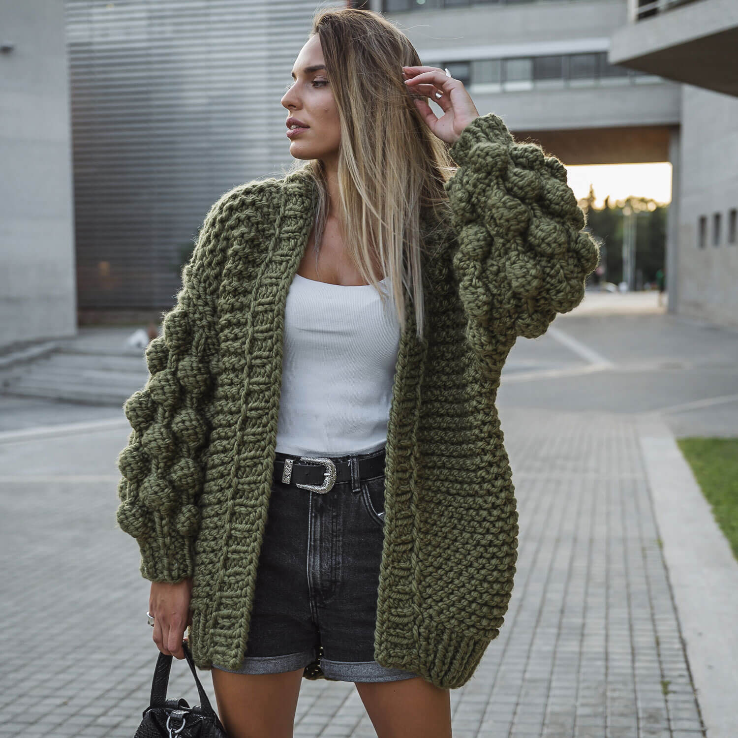 The chunkier - the cuter! This vintage 70s handmade cardigan is roomy in a slightly oversized fit. easy to carry it anywhere you go in fall and winter. Made out of thick. bulky yarns. this heavy knit crocheted knitwear staple has a classic loose fit to cuddle with on the chilly days and cooler nights. and chunky popcorn knitting long sleeves with a touch of boho. the will make you unique in your daily life. This statement-making bubble-sleeve cardigan comes in several versions that you can style this warm outfit on your own.