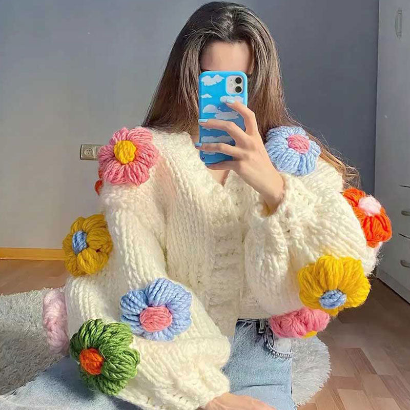 The chunkier - the cuter! Scream for a photo op with this beautiful statement-making floral cardigan. Thanks to the colorfully crocheted flowers and the fun loose fit. this open-front cardigan made out of thick. bulky yarns. is oversized. snuggly. and easy to wear in a 70s fashion way. Apart from its generous fit. we particularly love the puffy elongated long sleeves. dropped shoulders. chunky textured rib knit edges and the crop length. Match it with your favorite high waist jeans and our pink tube top for a head-turning warm outfit in sweater weather.