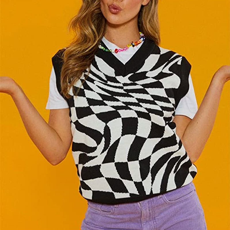 Add a modern twist on your monochromatic vest for the transitional seasons. Featuring swirling print and abstract checkered patterns. the sweater vest is in a chic preppy style with the layering-friendly V neckline and ribbed trims. The easy relaxed silhouette makes it highly-versatile to worn worn solo or layered over your basic tops. For a casual chic vibe. complete the look with a white T-shirt under and add your favorite pants.