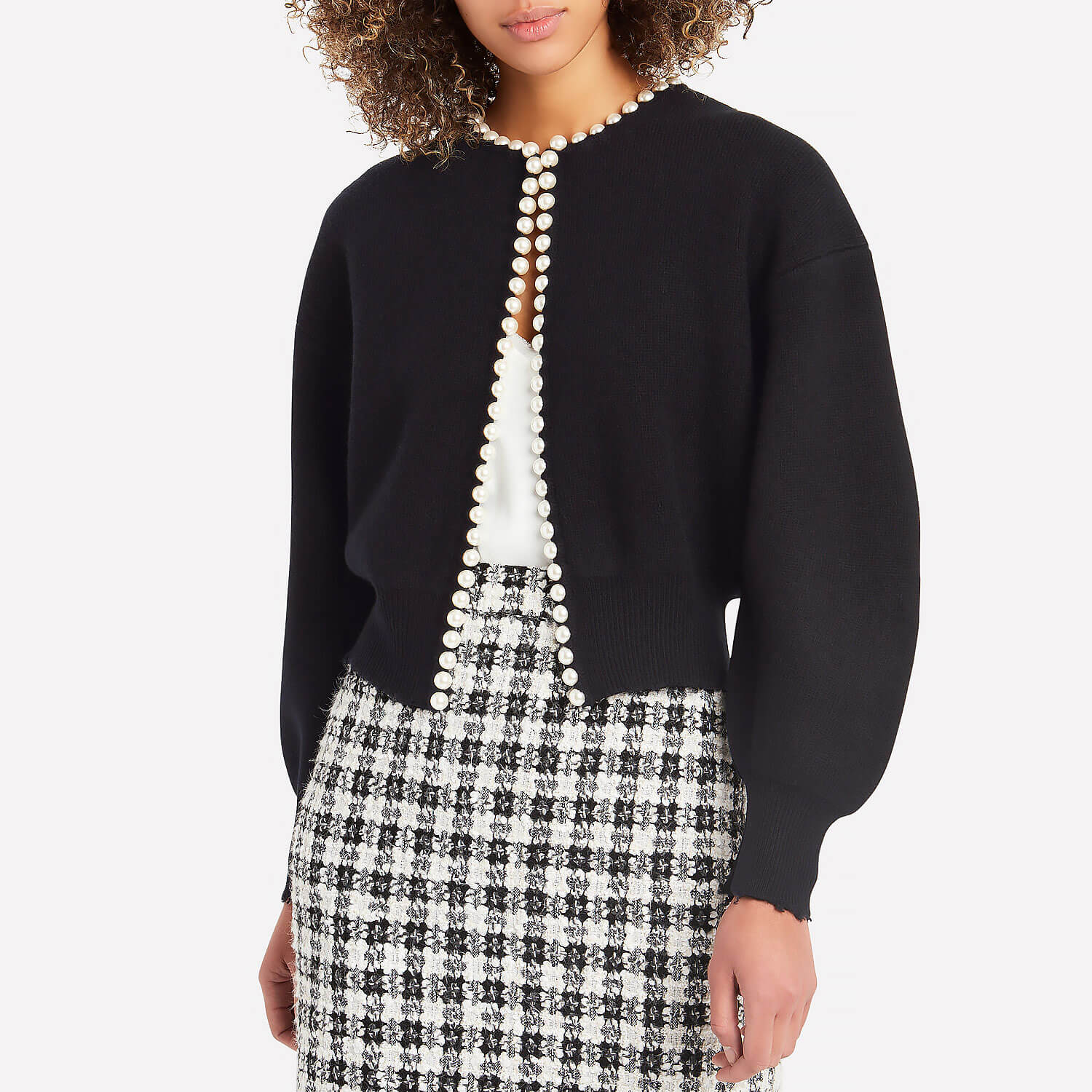 This cardigan is elegant in its simplicity and contemporary design. Crafted from medium-weight cotton blended fabric with soft handles. it's luxuriously beaded with faux-pearl embellishment along the crew-neck and open-front placket. It's cropped to a relaxed silhouette with a banded hemline while the raw. ripped trims and slouchy drop-shoulder make for a modern twist on the trend. Having a hook-and-eye closure to the front. it's super versatile for your everyday styling in the transitional season. Try to achieve your minimalist aesthetic by pairing it with an A-line skirt and Mary Jane shoes.