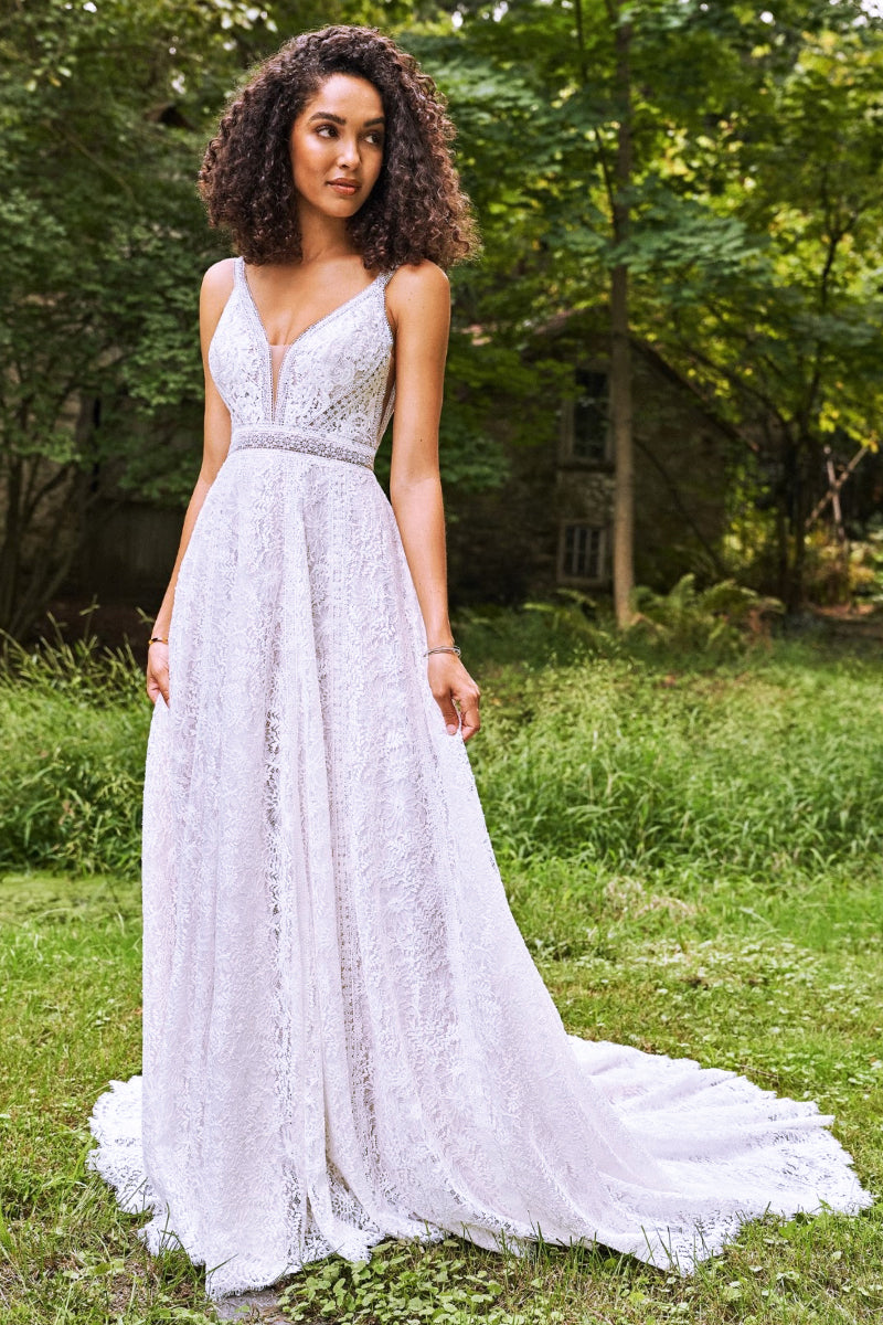 The Enchanting Eternity Lace A-Line Wedding Dress is a beautiful reminder that love lasts forever! Rustic and effortless. this bridal gown is for the easy-going bride. It features a feminine allover corded lace that is perfectly blended with floral lace trims on the bodice and throughout the skirt. The plunging V-neckline is matched with a V-back and the lightweight skirt is finished with a scalloped eyelash lace hem. An easy sweep length train is the finishing touch.