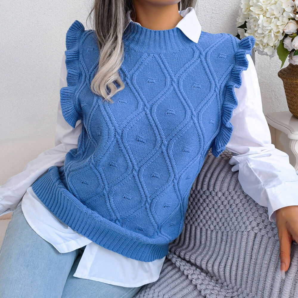 Equal parts racy and pretty. This sweater vest takes a solid knit into a fresh silhouette. It's crafted soft acrylic yarns with the playful stringy selvedge trims along the armholes for a sense of uniqueness. The chunky cable pattern across the front is nestled with lightly distressed detail for a chic look. The crew-neck sweater vest is also traced by the ribbed trims. making it an elongated piece which can be worn year after year. Layer it on a shirt with its collar and shirt-tail sticking out and match it with a pleated skirt and loafers to keep it cute and trendy.