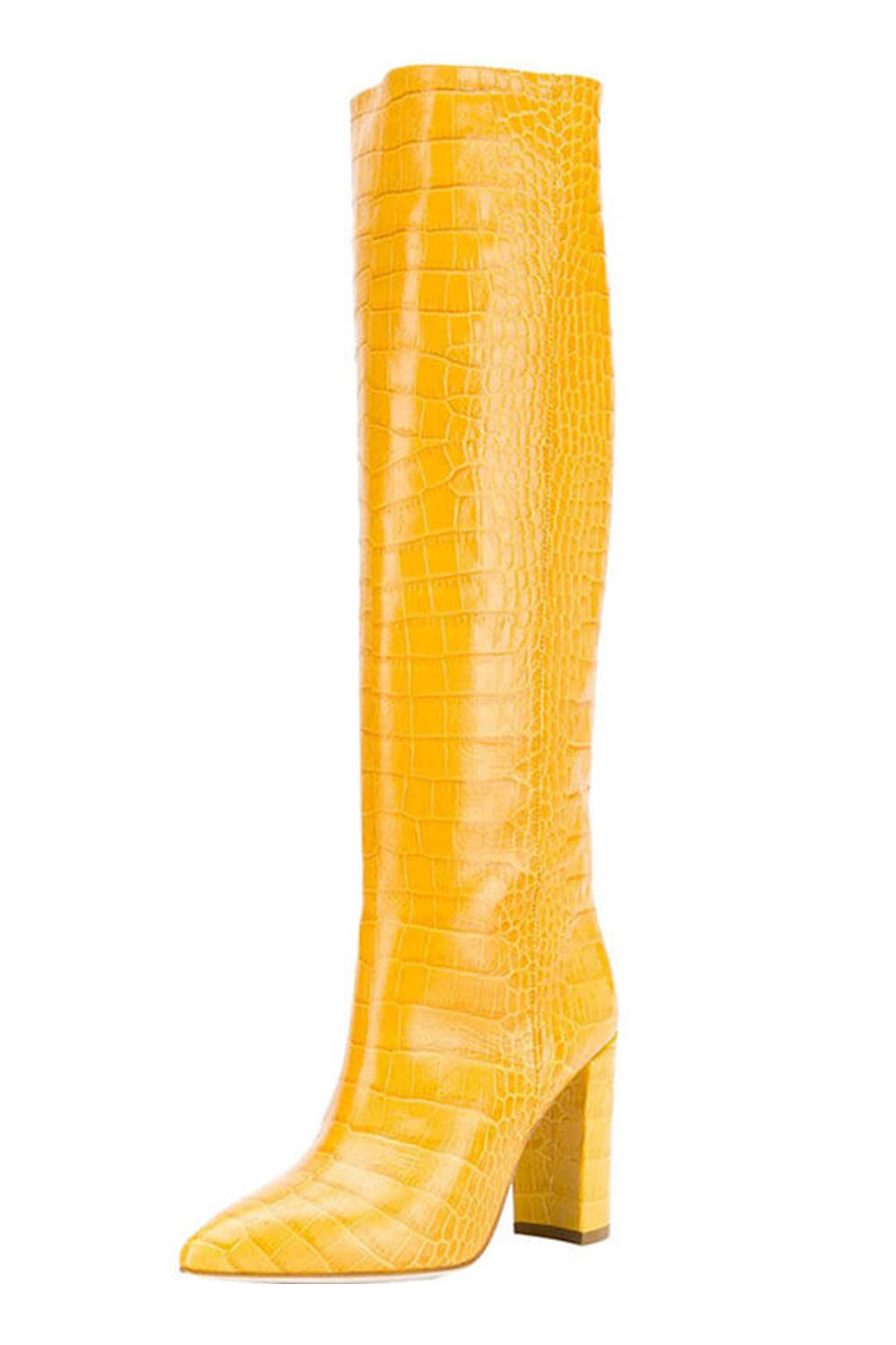 Croc-Effect Faux Leather Pointed Toe Block Heel Knee-High Boots - Yellow