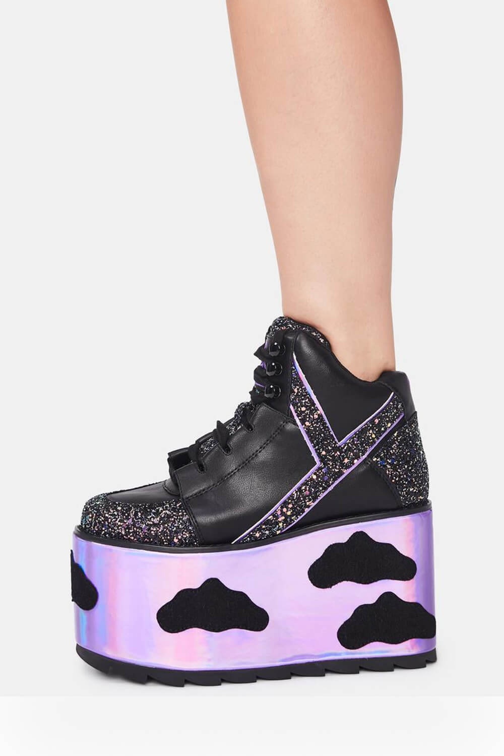 Sky Glitter Platform Lace Up Boots With Cloud Patches Detailing - Black