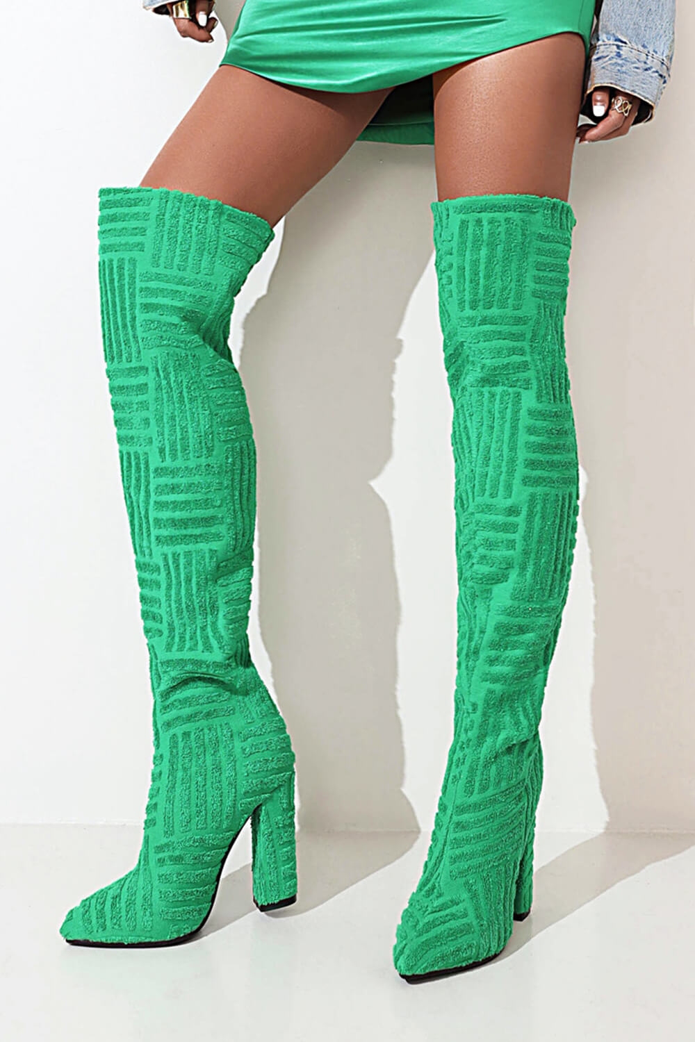 Terry Towel Point Toe Over The Knee High Block Boots - Green