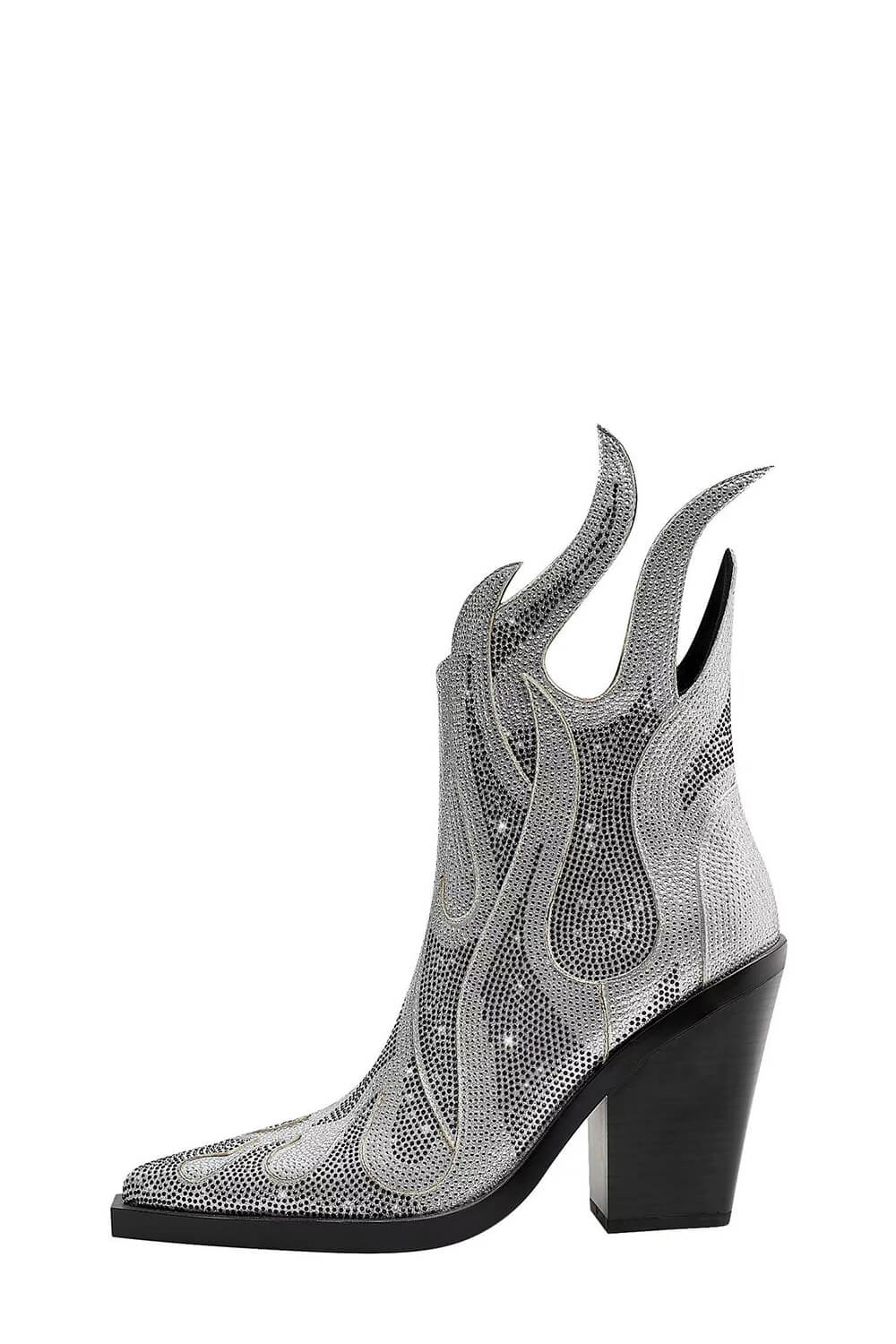 Decrease quantity for Rhinestone-Embellished Flame Mid-Calf Western Cowboy Pointed Toe Block Heeled Boots - Silver