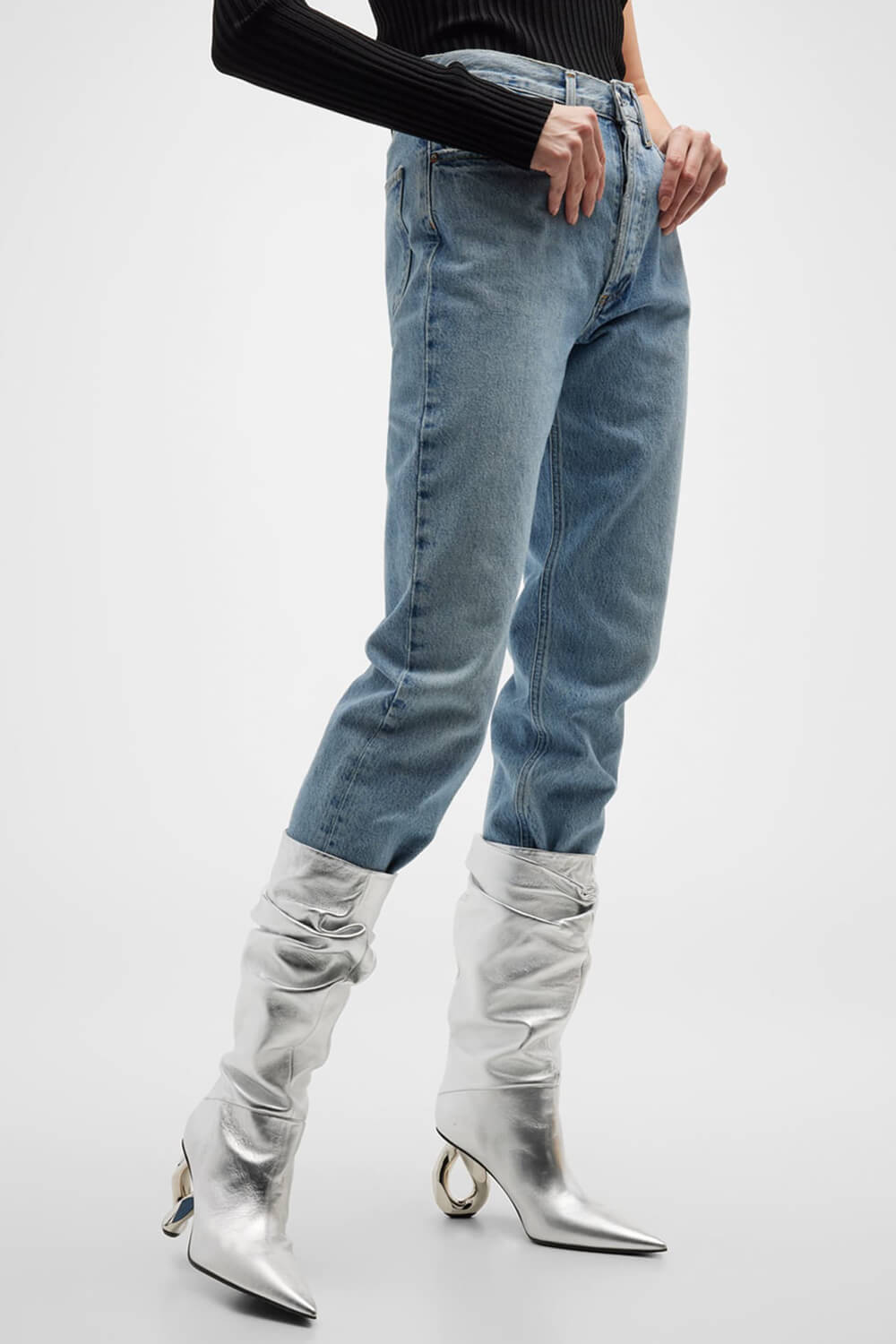 Decrease quantity for Metallic Slouchy Pointed Toe Chain-Heel Mid Boots - Silver