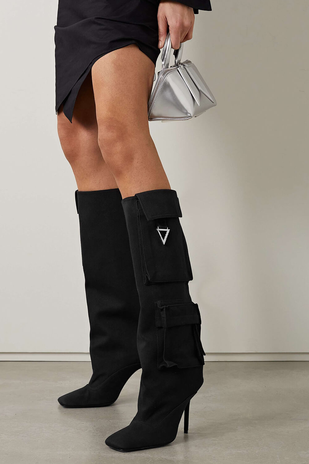 Denim Flap Pocket Embellished Square Toe Knee-High Stiletto Heeled Boots - Black