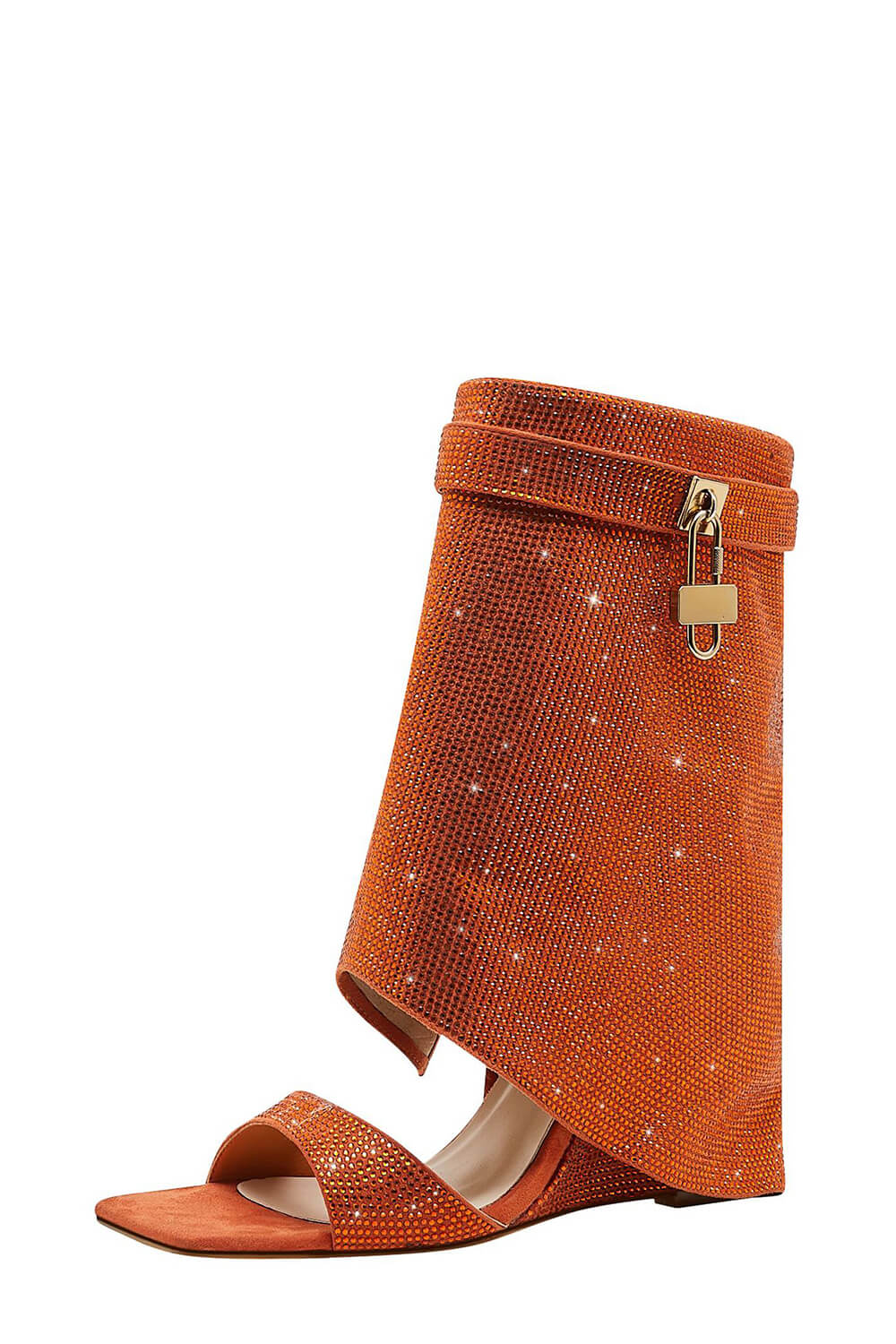Gem Embellished Diamante Padlock Fold Over Wedge Heeled Sandals - Orange