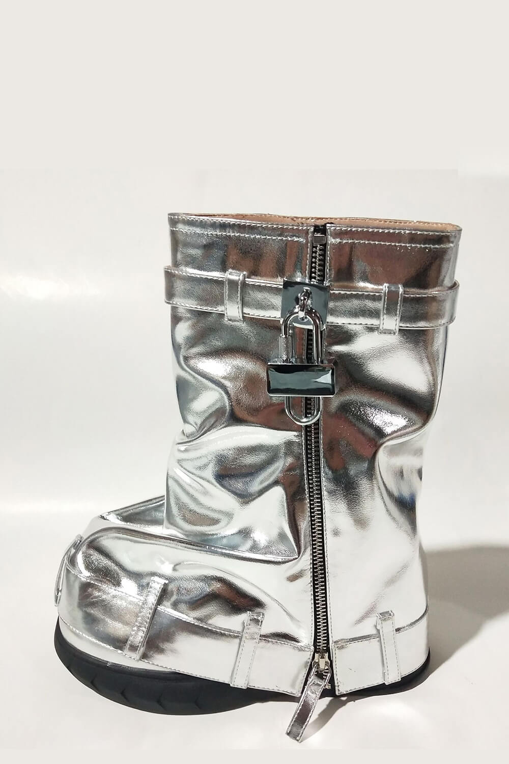 Wrapped Faux Leather Padlock Detail Folded Wedge Heel Mid Calf Chunky Biker Boots - Silver