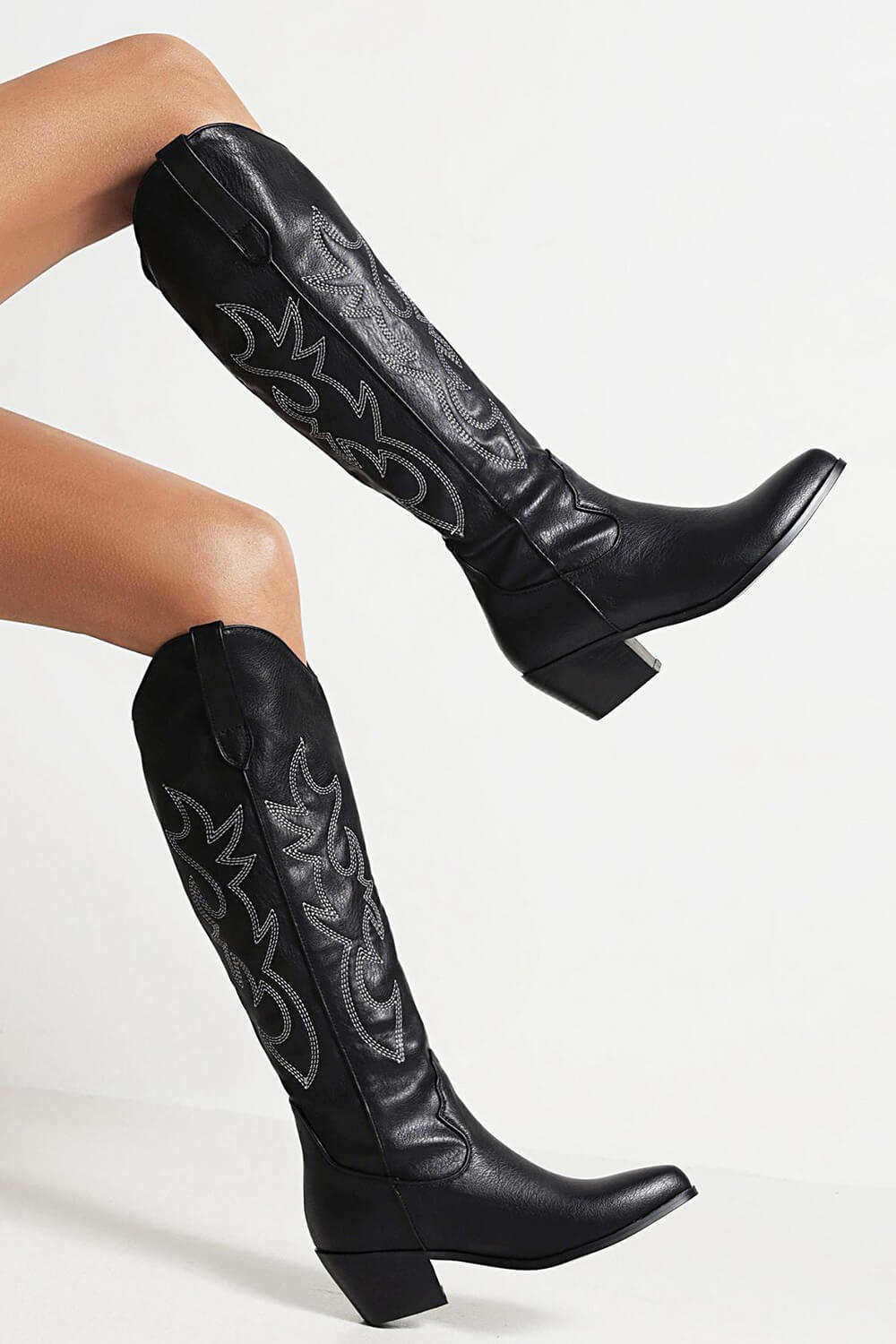 Leather Western Cowboy Almond Toe Knee High Block Heeled Boots - Black