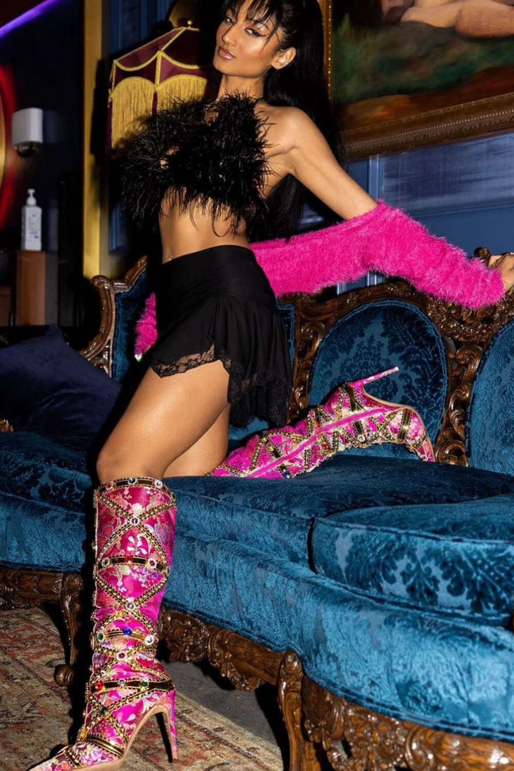 Floral Satin Gemstone-Embellished Pointed Toe Knee High Stiletto Boots - Pink