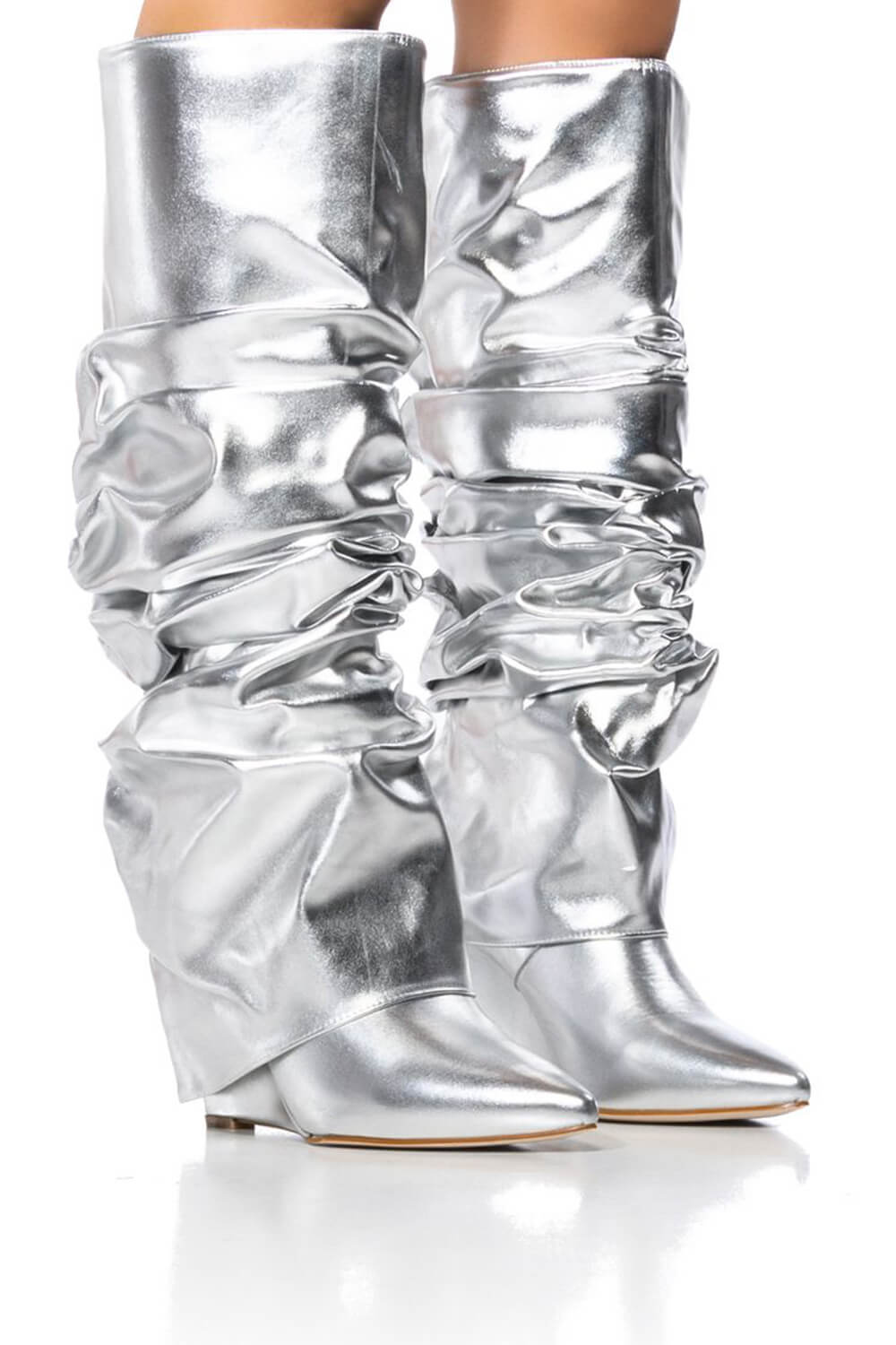 Scrunched Foldover Mid Calf Wedge Heel Boots - Silver