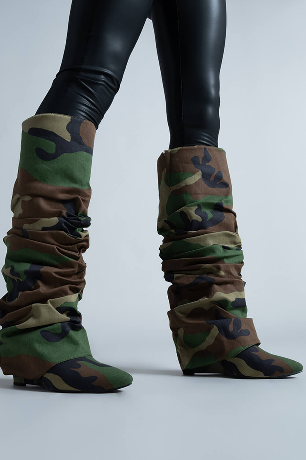 Scrunched Foldover Mid Calf Wedge Heel Boots - Camouflage