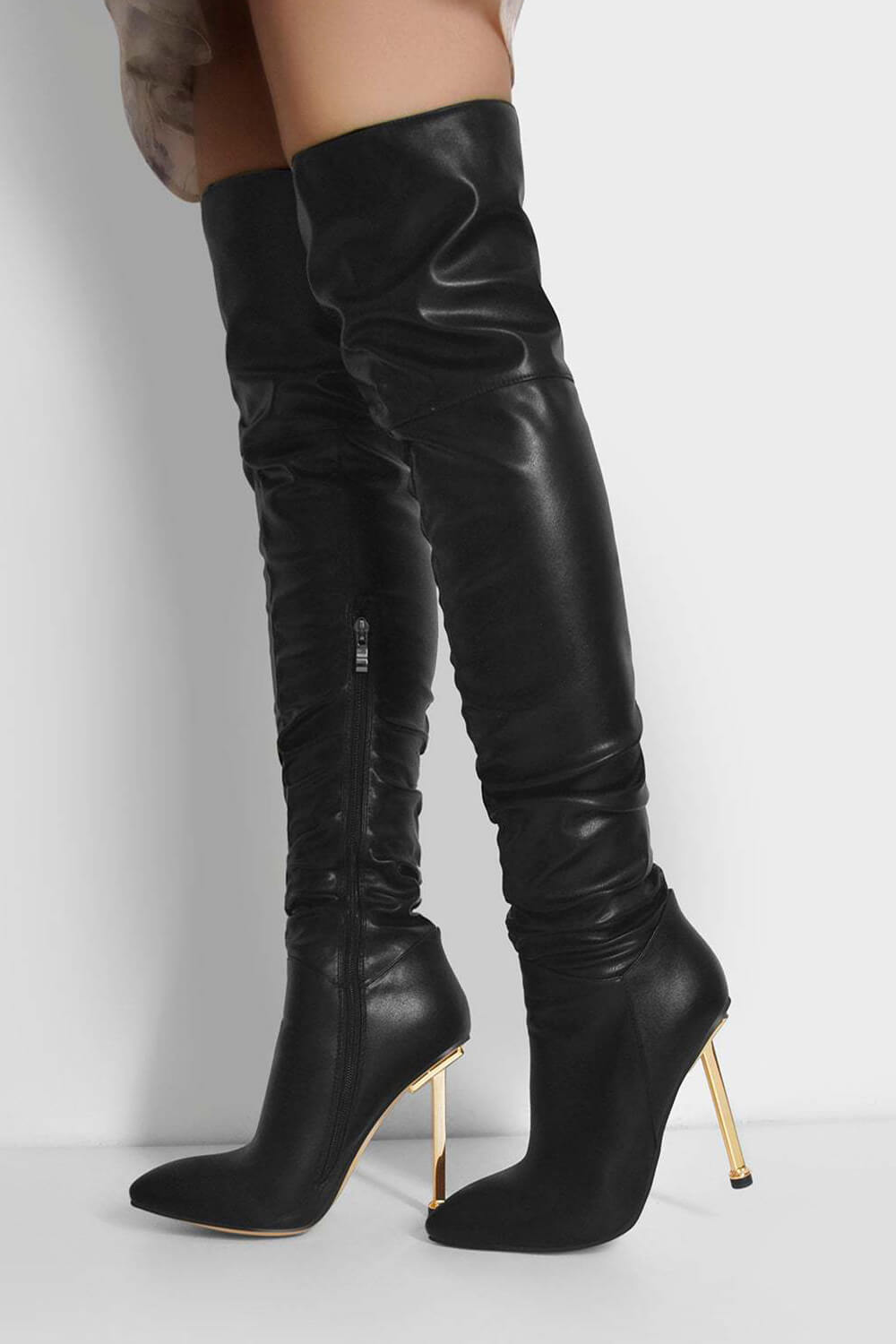 Faux Leather Ruched Point Toe Stiletto Thigh High Boots