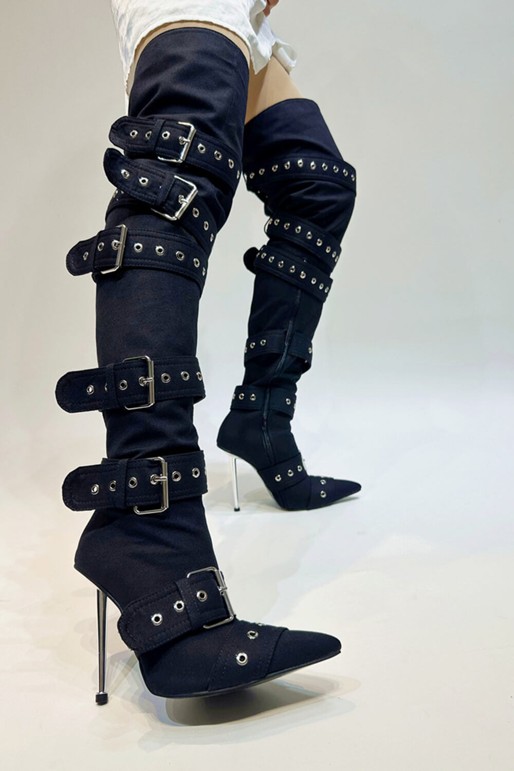 Multi Buckle Pointed Toe Thigh High Stiletto Heel Boots - Black
