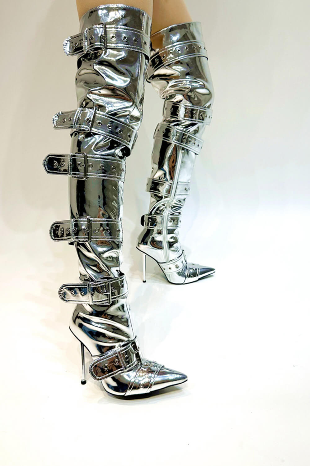 Multi Buckle Pointed Toe Thigh High Stiletto Heel Boots - Silver