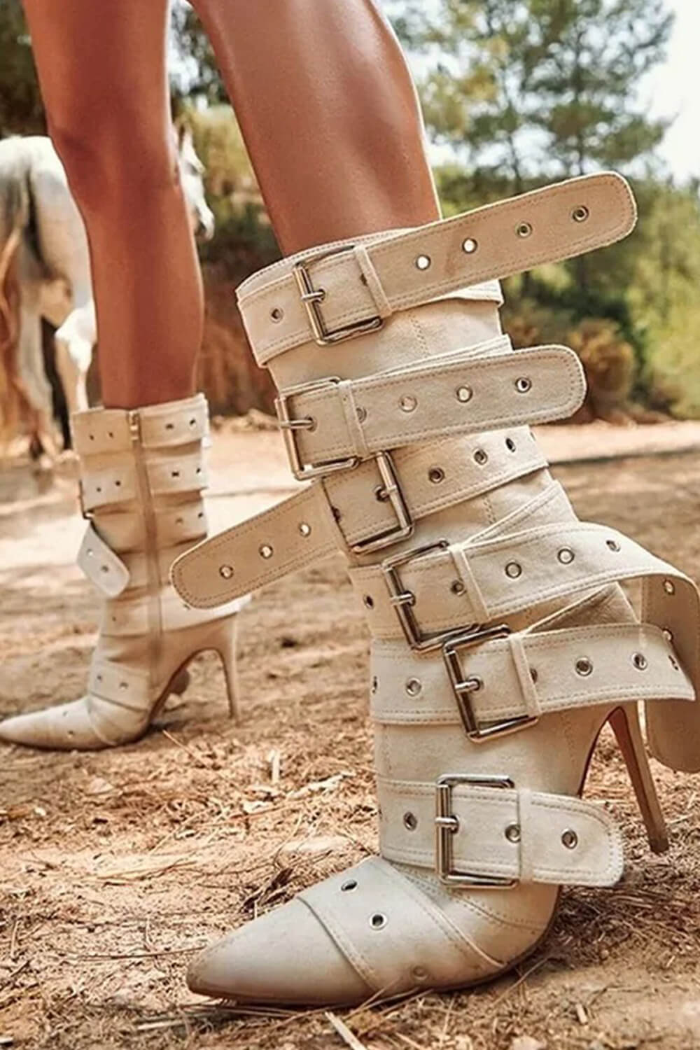 Multi Buckle Pointed Toe Above The Ankle High Heel Boots - Nude