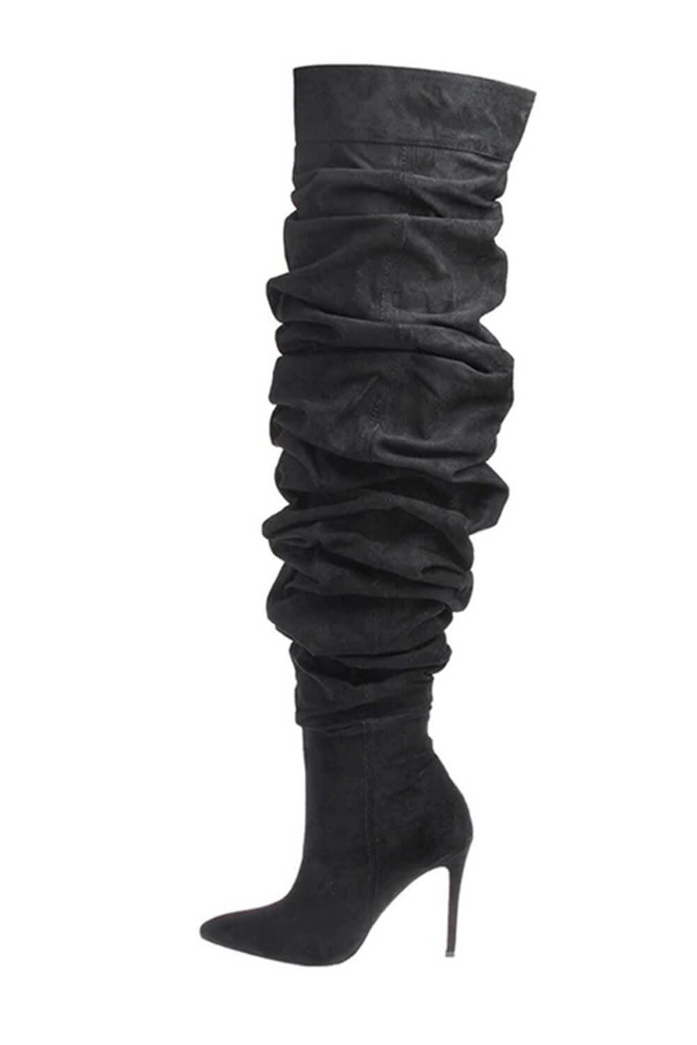 Decrease quantity for Denim Ruched Over-The-Knee Pointed Toe Stiletto Boots - Black
