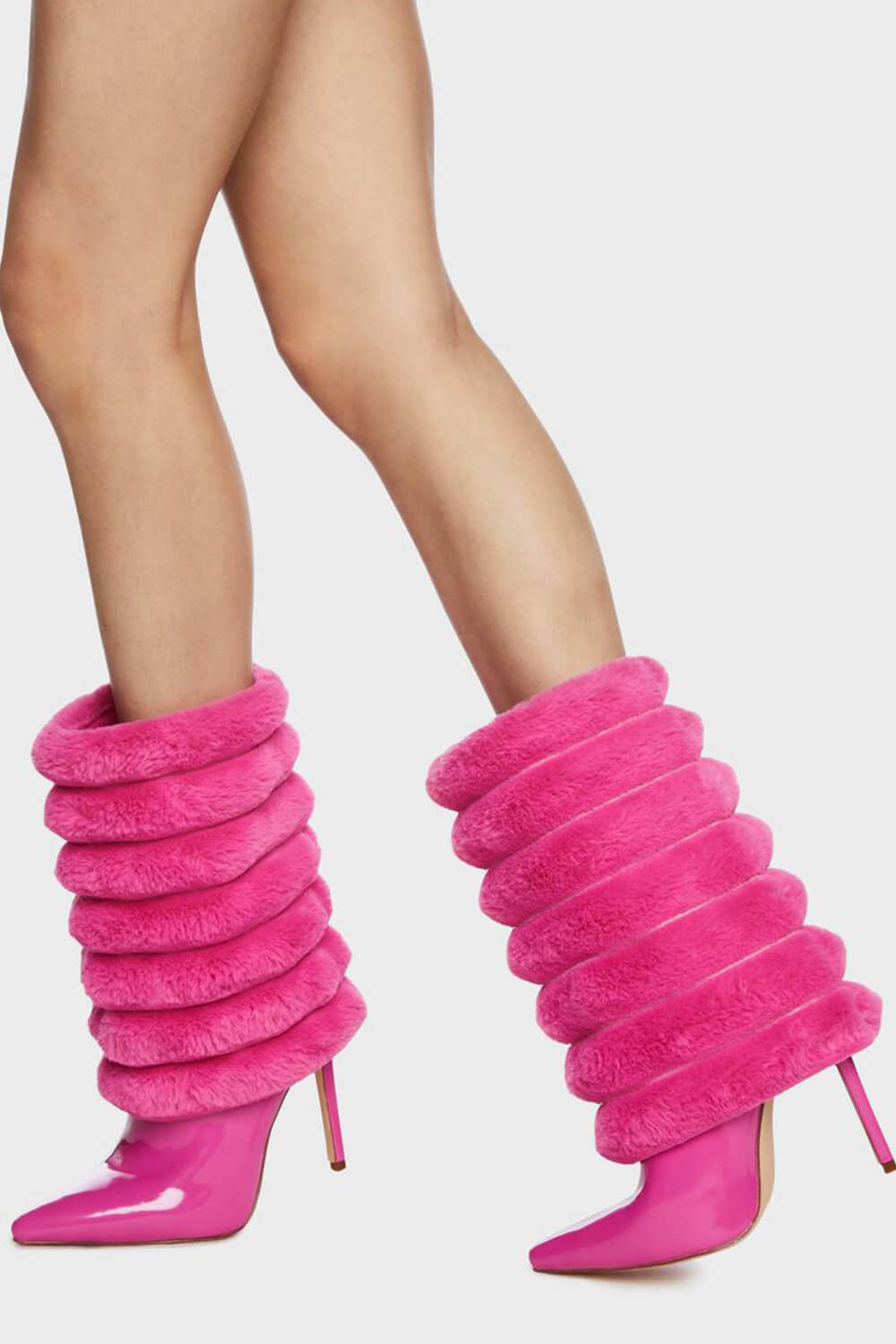 Hot Pink Patent Channeled Faux Fur Mid-Calf Stiletto Heel Boots