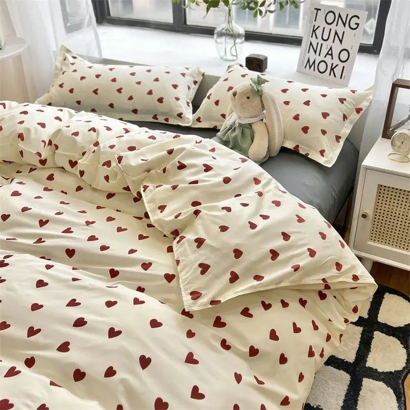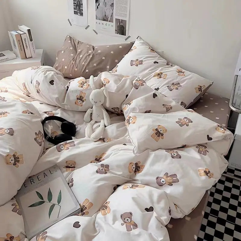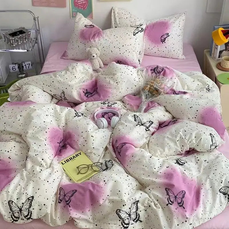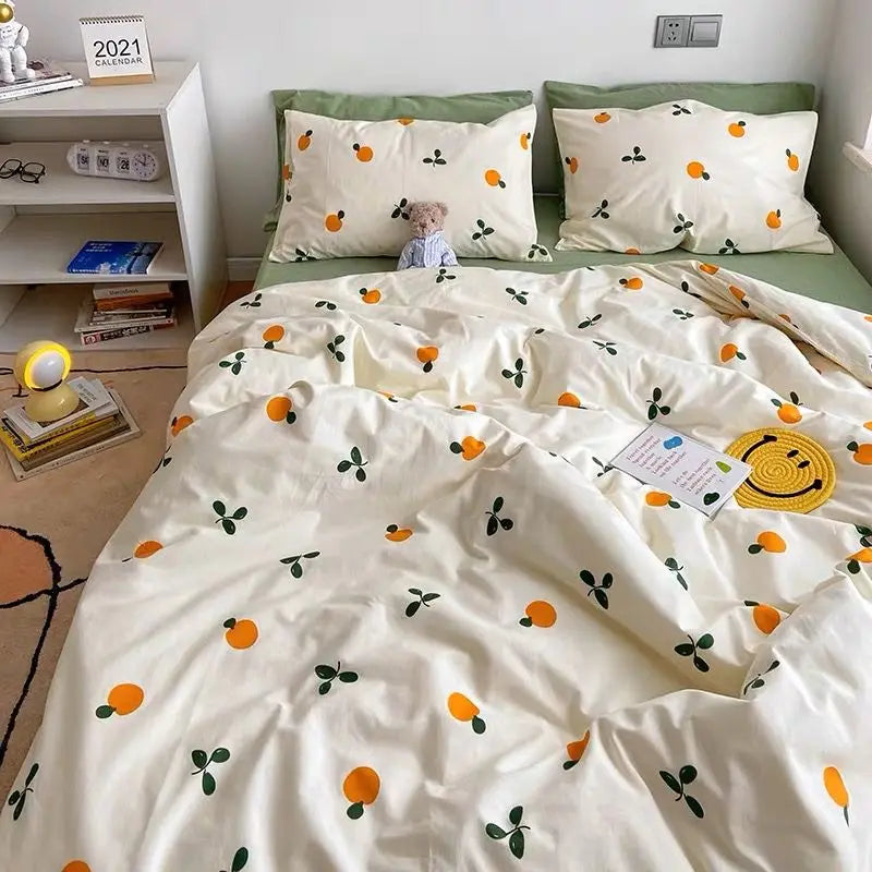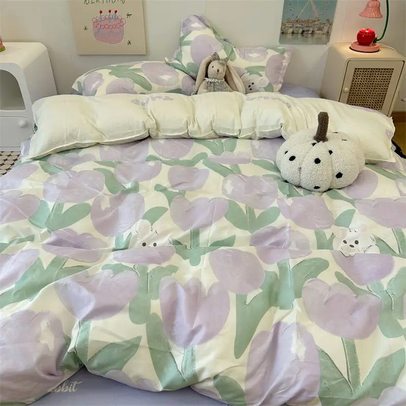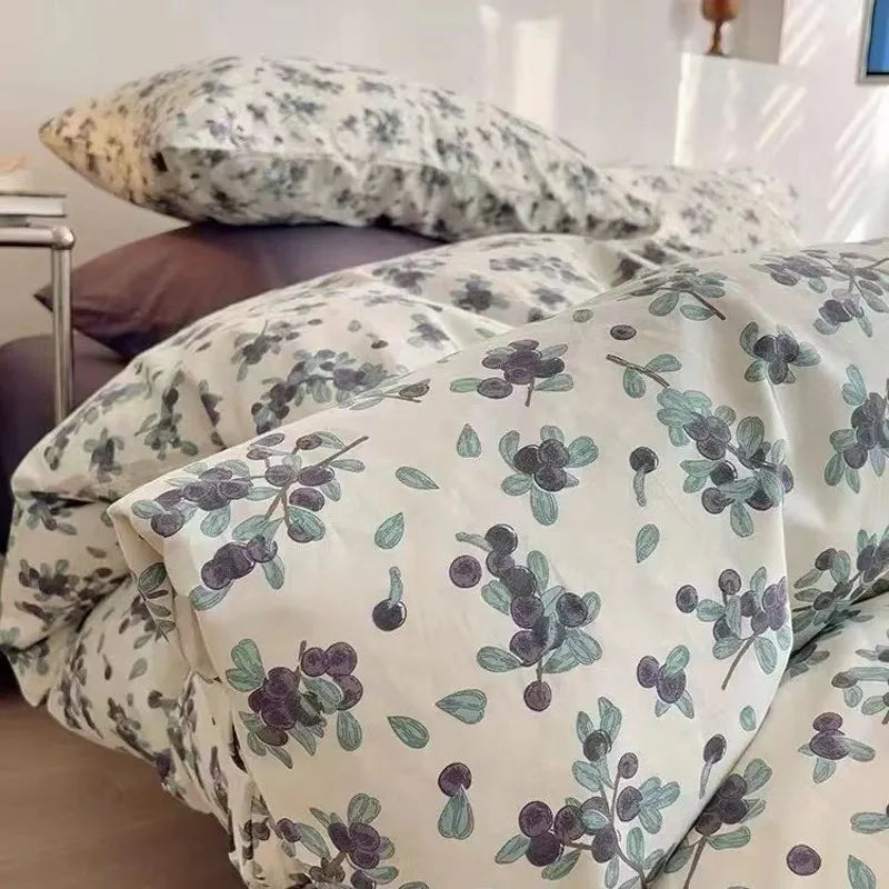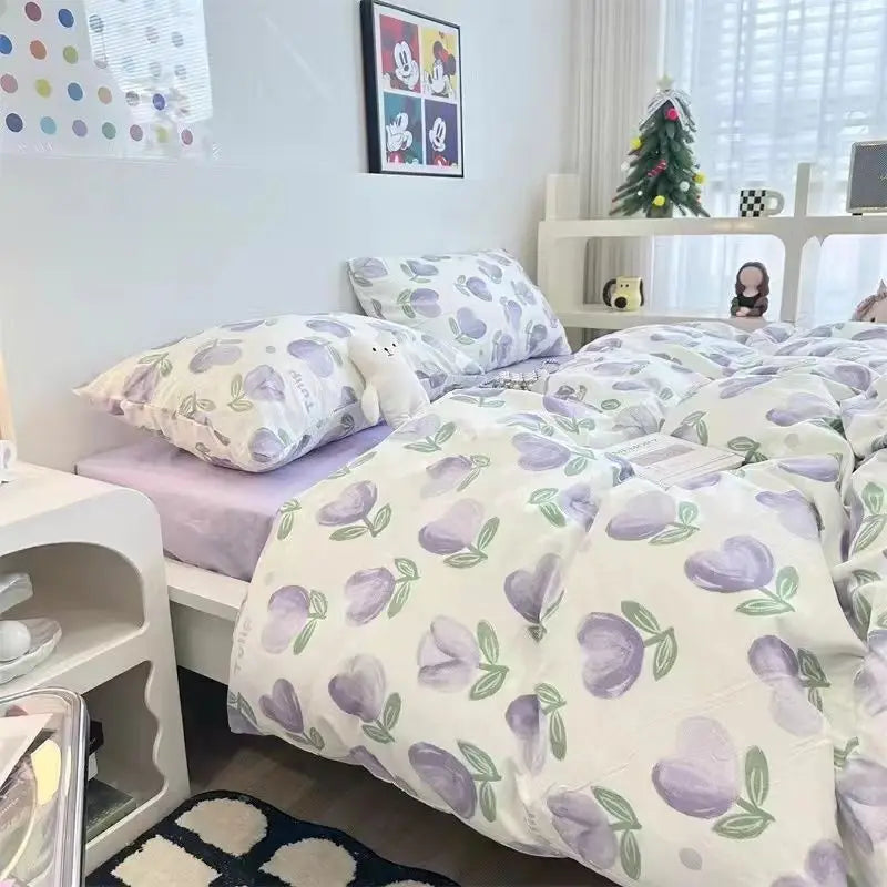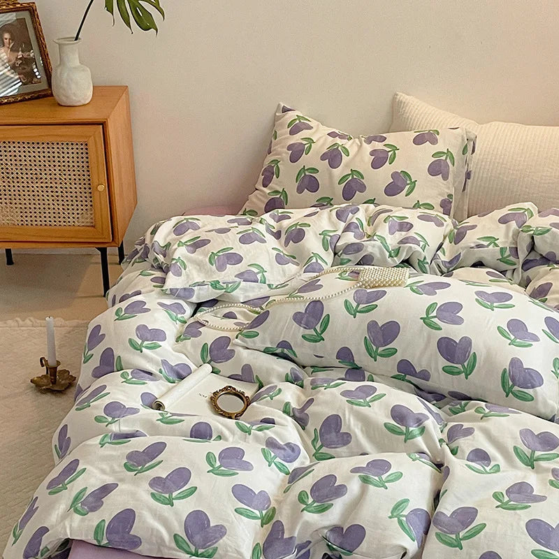 Floral Korean Style Duvet Cover Set No Filler Pillowcase Flat Sheet Twin Queen Size Boys Grils Romantic Bedding Kit