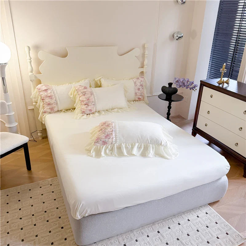 Korean Princess Style Lace Ruffles Rose Embroidery Wedding Bedding Set Duvet Cover Set Flat/Fitted Bed Sheet Pillowcases 4Pcs