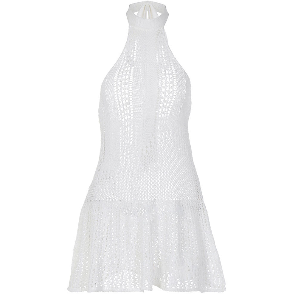 Your upcoming vacation is calling for effortless chic halter neck dresses like this cute crochet sundress. This versatile sleeveless knit dress features a bow tie around the neck. mixed with several crocheted patterns for a breezy semi-sheer silhouette into a fluttery flouncy micro-short length. Made of lightweight knit fabric and designed for breathability. this resort-inspired knitted minidress screams summer with you. Pair it with your crochet tote and wedge-soled espadrilles for an on-the-go trip. Available in flattering white and boho-chic green versions for infinite outfit possibilities.