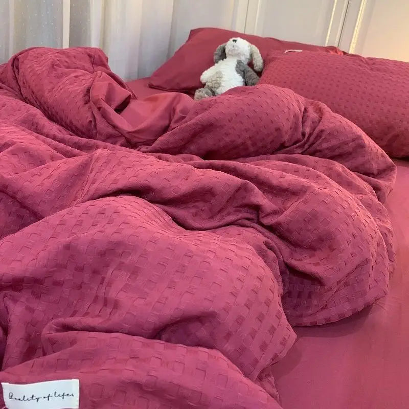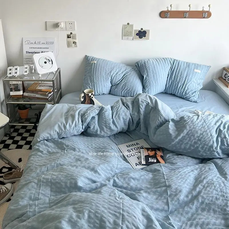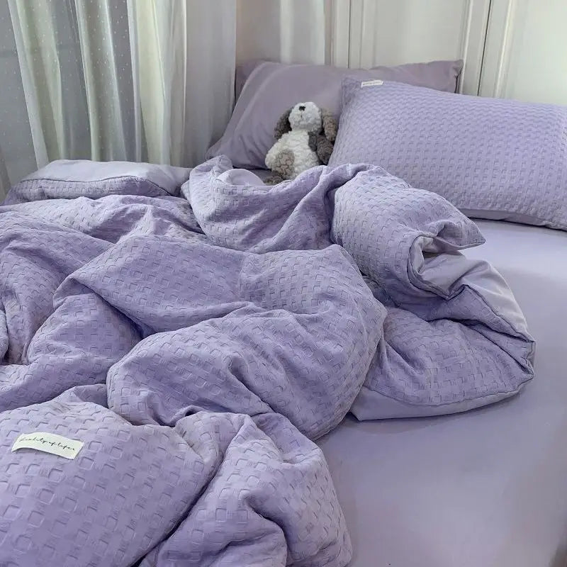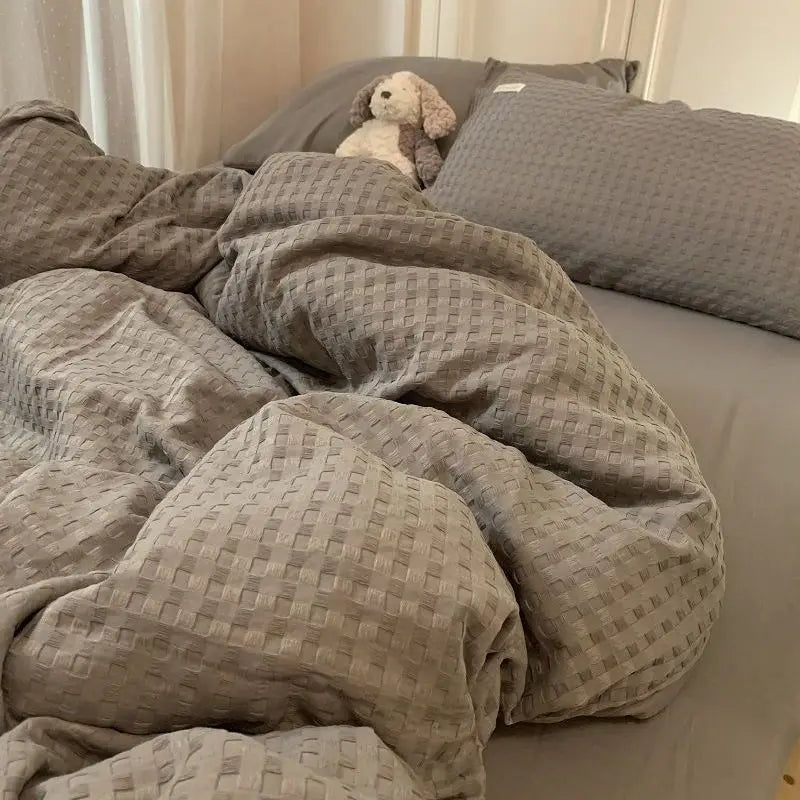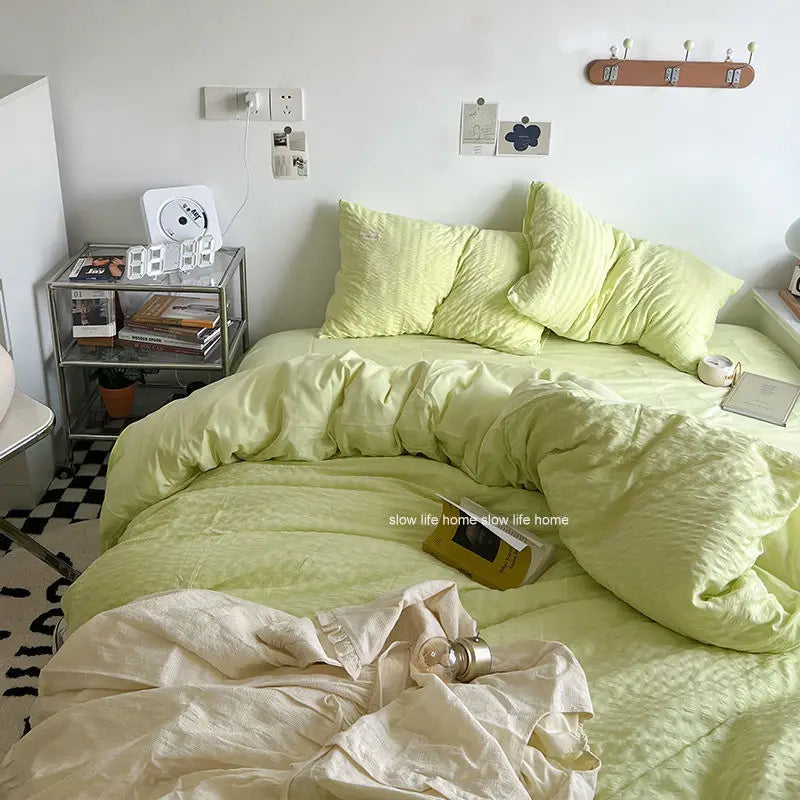 High grade light luxury washable cotton waffle four piece bedding set olive green quilt cover bed sheet dormitory three piece