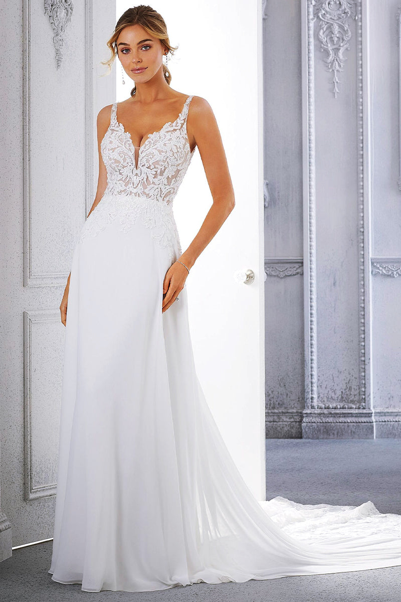 You'll have every heart beating faster when you walk out wearing the Kelsey Chiffon & Lace Wedding Dress! Effortlessly elegant this sleeveless gown features lace applique bodice and deep v-neckline. The simple A-line skirt cascades down the body to a lovely cut-away lace train. and we can't forget the beautiful scoop open back accented by lace on sheer fabric.